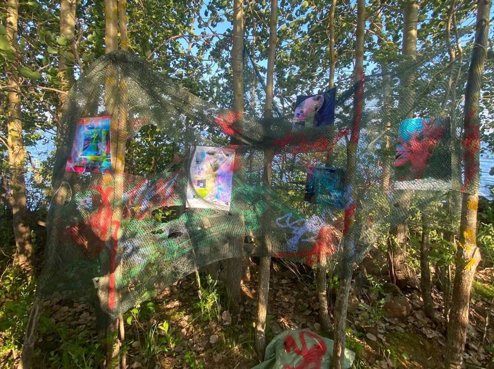 Уходя от городской среды, чреватой столкновениями с силовиками, художественные активисты проводят мероприятия в лесах под Петербургом. В ленте Instagram корреспонденту The Insider попадается афиша выставки на природе «Насквозь». Аккаунт создан за несколько дней до выставки, в нем всего 95 подписчиков. Мероприятие не настолько секретно, как те, что проводятся в черте города, но и добраться до него непросто. Подписавшись на аккаунт «Насквозь» и сделав репост, можно получить от организаторов сообщение с точными координатами и фотографиями дороги.
