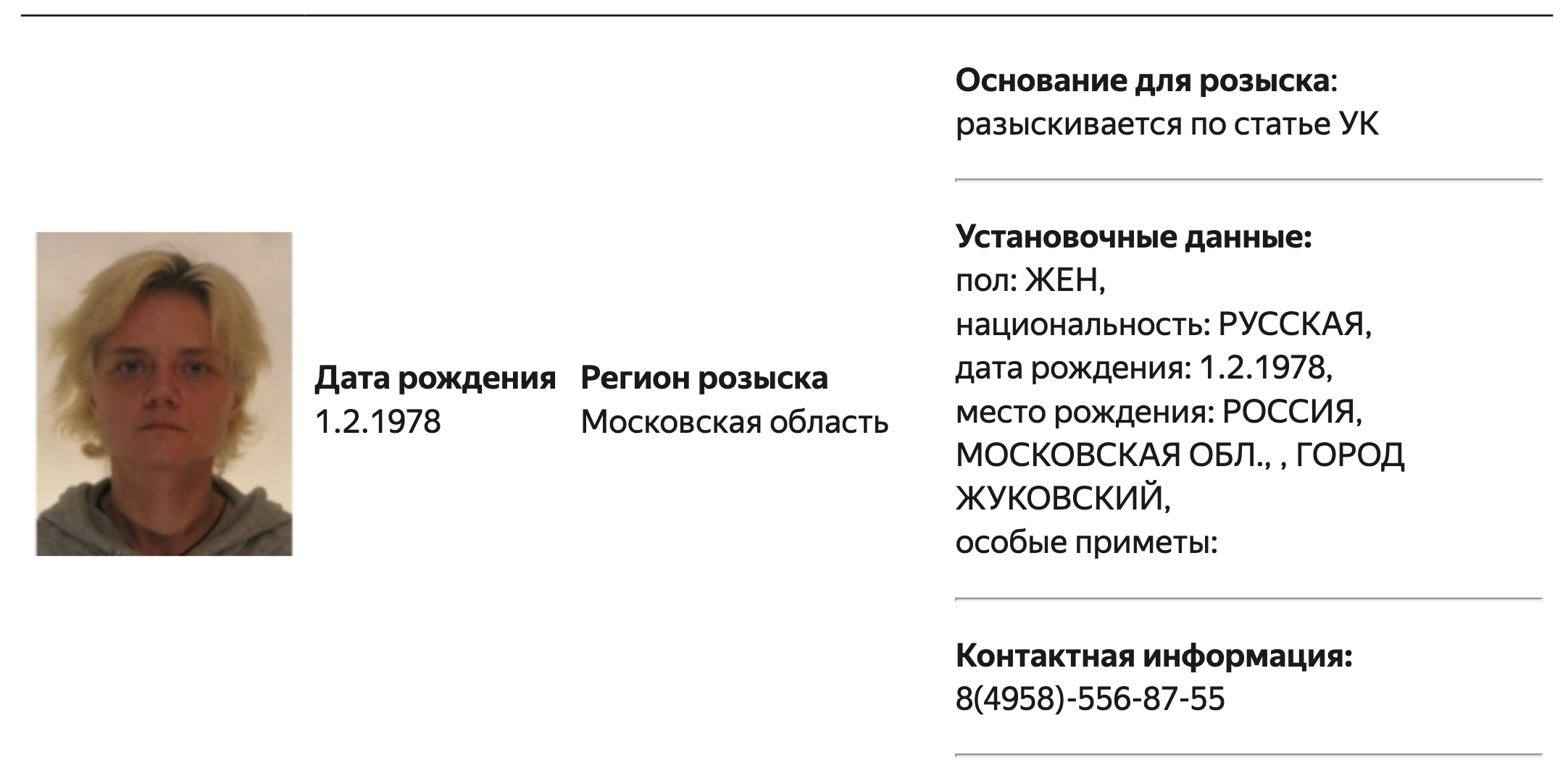 МВД объявило в розыск редактора подмосковного независимого издания «Жуковские вести» Элу (Аэлиту) Знаменскую. Соответствующую карточку в базе розыска ведомства обнаружила «Медиазона».