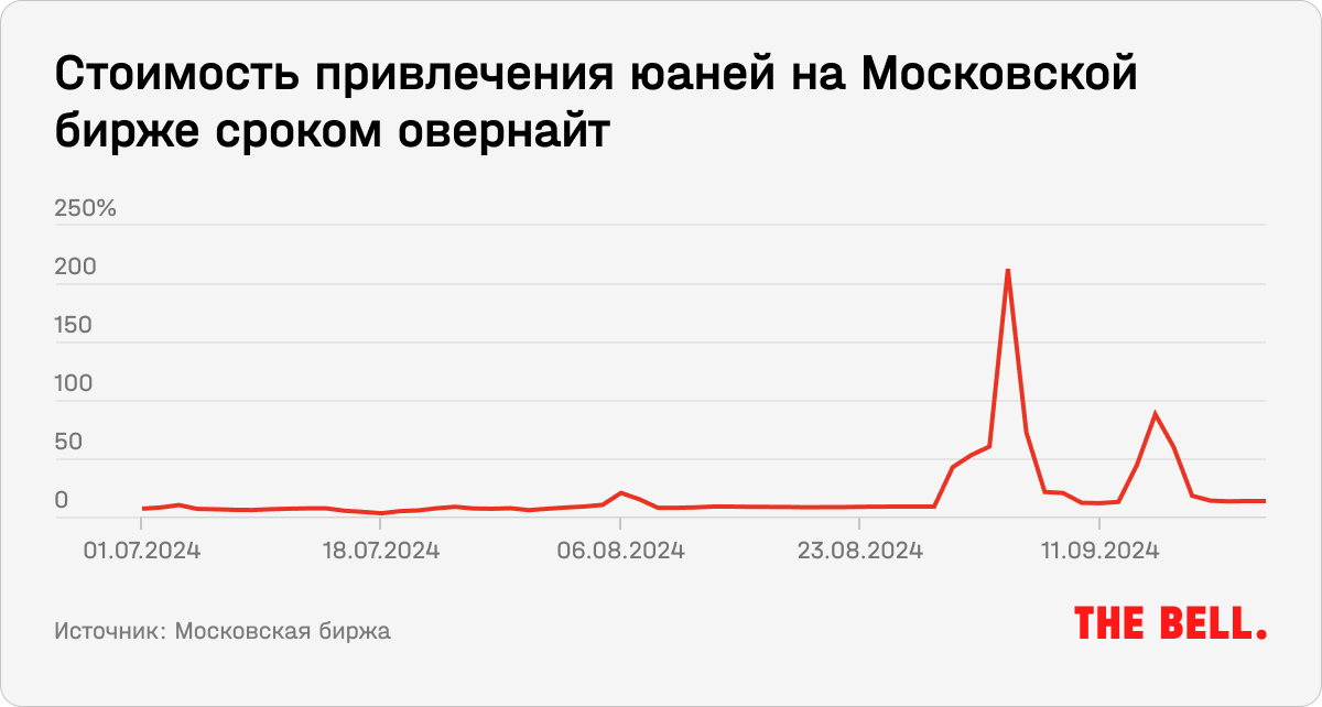 Дополнительно ситуацию с ликвидностью китайской валюты усугубляло наступление 20 сентября даты первой возможной оферты по первому выпуску юаневых облигаций «Роснефти» на 15 млрд юаней, указывали в «Альфа-банке». К этой дате банки старались аккумулировать юани, необходимые компании при предъявления облигаций к погашению. После выплаты ставка привлечения юаней на Московской бирже снизилась с 17,76% до 13,54%.
