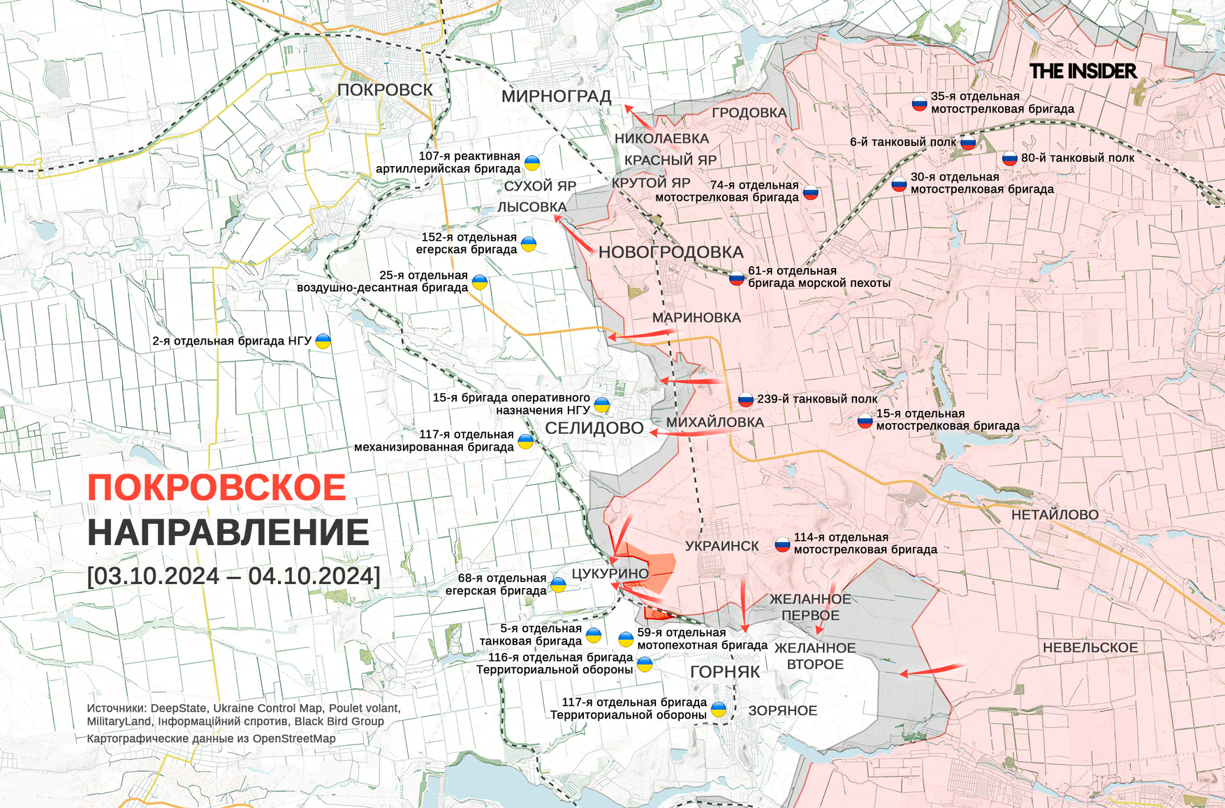 Критическая инфраструктура Покровска (до 2016 года — Красноармейск) повреждена на 80% из-за постоянных обстрелов, заявил начальник городской военной администрации Сергей Добряк. По официальным данным, в городе остаются 13 050 жителей, в том числе 94 ребенка. DeepState отмечает, что хотя ВС РФ были остановлены под Селидовым, они пытаются обойти и охватить этот населенный пункт с флангов, в том числе со стороны Цукурино.