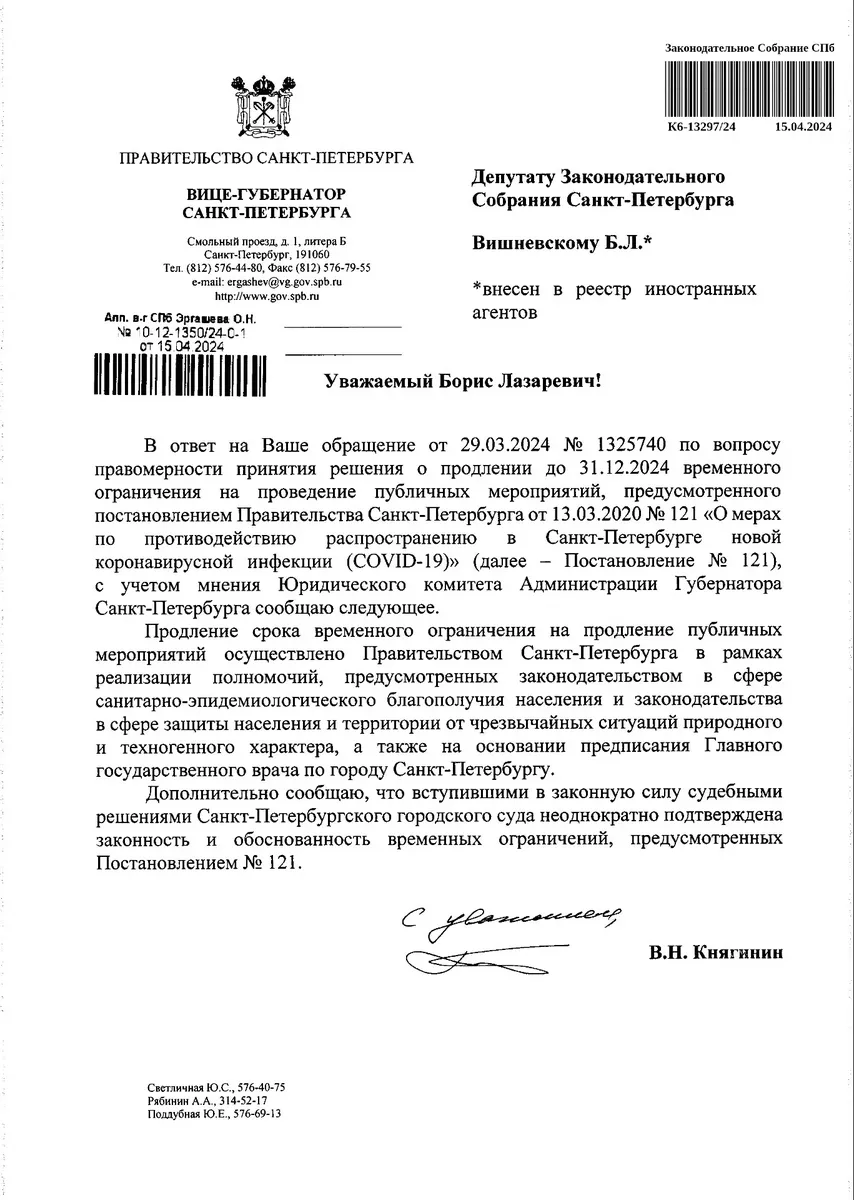 В апреле 2024 года я отправил от имени фракции «Яблоко» обращение к губернатору Александру Беглову: отмените наконец этот абсурдный запрет!
