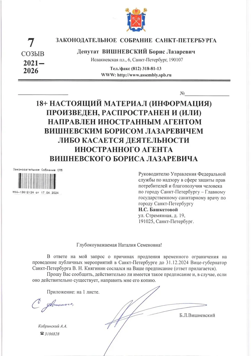 Написал главному санитарному врачу Башкетовой, прося сообщить, действительно ли она давала предписание о продлении «митингового» запрета, причем сразу на девять месяцев, и на каком основании. И попросил предоставить текст предписания, чтобы понять, какие там аргументы.