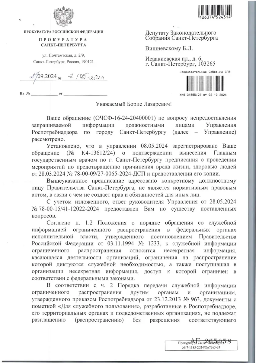 В данном случае мы имеем именно такую информацию, которую нельзя скрывать от граждан за забором «грифов». Характерно, что прокуратура не приводит ссылку на какой-либо федеральный закон, позволяющий рассматривать сведения об инфекционном фоне в Петербурге как государственную или служебную тайну. Да и нет таких законов, так как сведения об инфекционном фоне, в том числе о наличии либо отсутствии эпидемии, явно касаются всех и каждого…