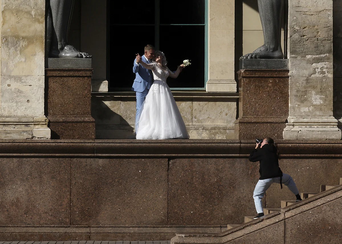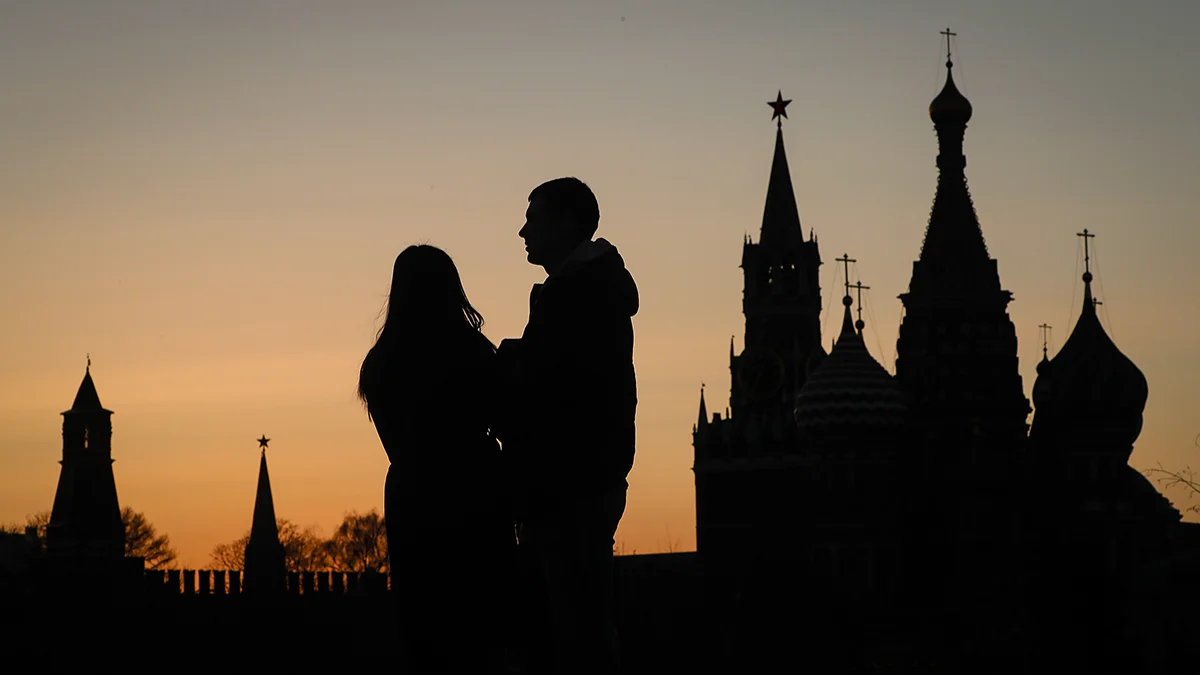 Пара стоит перед Московским Кремлем в Москве, Россия, 23 марта 2022 года. Фото: Юрий Кочетков / EPA-EFE