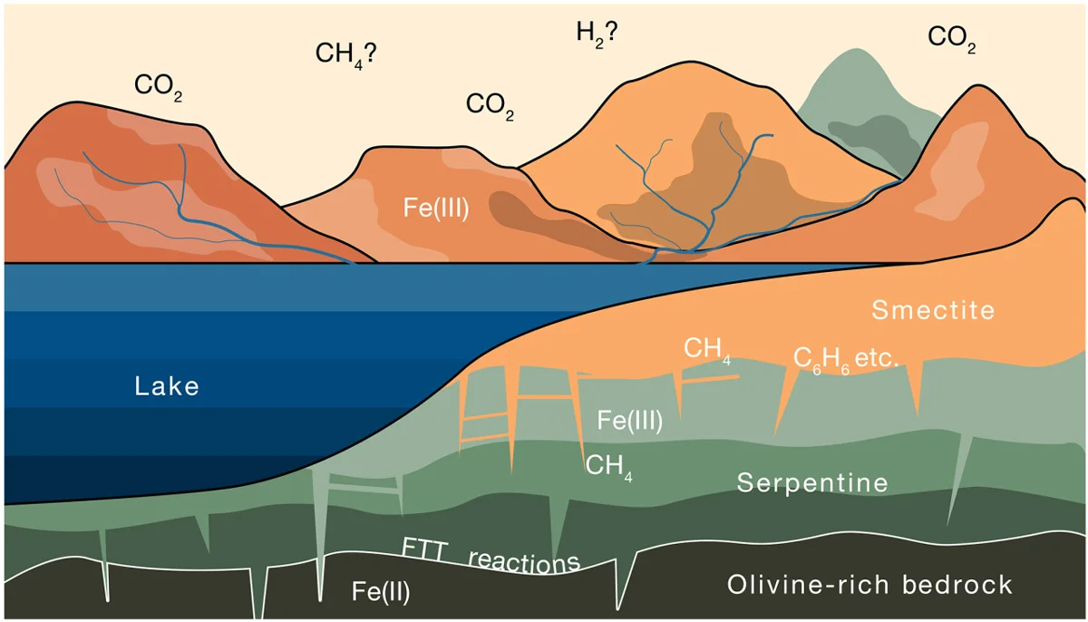 В сентябре 2024 года группа ученых во главе с Мэтью Хойнацки из Планетологического института США выяснила, что убыль атмосферы Марса происходила не только за счет ее «выветривания» в открытый космос, но также из-за особенности породы. Благодаря обилию глинистых минералов углерод, которым богата атмосфера планеты, захватывался и удерживался внутри породы. Ученые рассматривали смектиты — это разновидность глинистых минералов, на которые приходится около 62% наблюдаемых марсианских образцов. Предполагается, что в раннем Гесперийском периоде (от 3,74–3,5 до 3,46–2 млрд лет назад) на Марсе было много оливина, который содержит железо. При его взаимодействии с водой происходит процесс серпентинизации, в ходе которого образуются серпентины и магнетит, железо окисляется, а из воды выделяется водород, реагирующий с углекислым газом с образованием метана. Его и захватывали смектиты, которые образовывались из серпентинов под действием воды. Если на Земле углерод из литосферы способен возвращаться в атмосферу из-за тектонических процессов и активности биосферы, то на Марсе заключен в минералах в течение длительного времени. Эти минералы могут стать потенциальным источником метана для астронавтов в ходе будущих пилотируемых полетов на Красную планету.