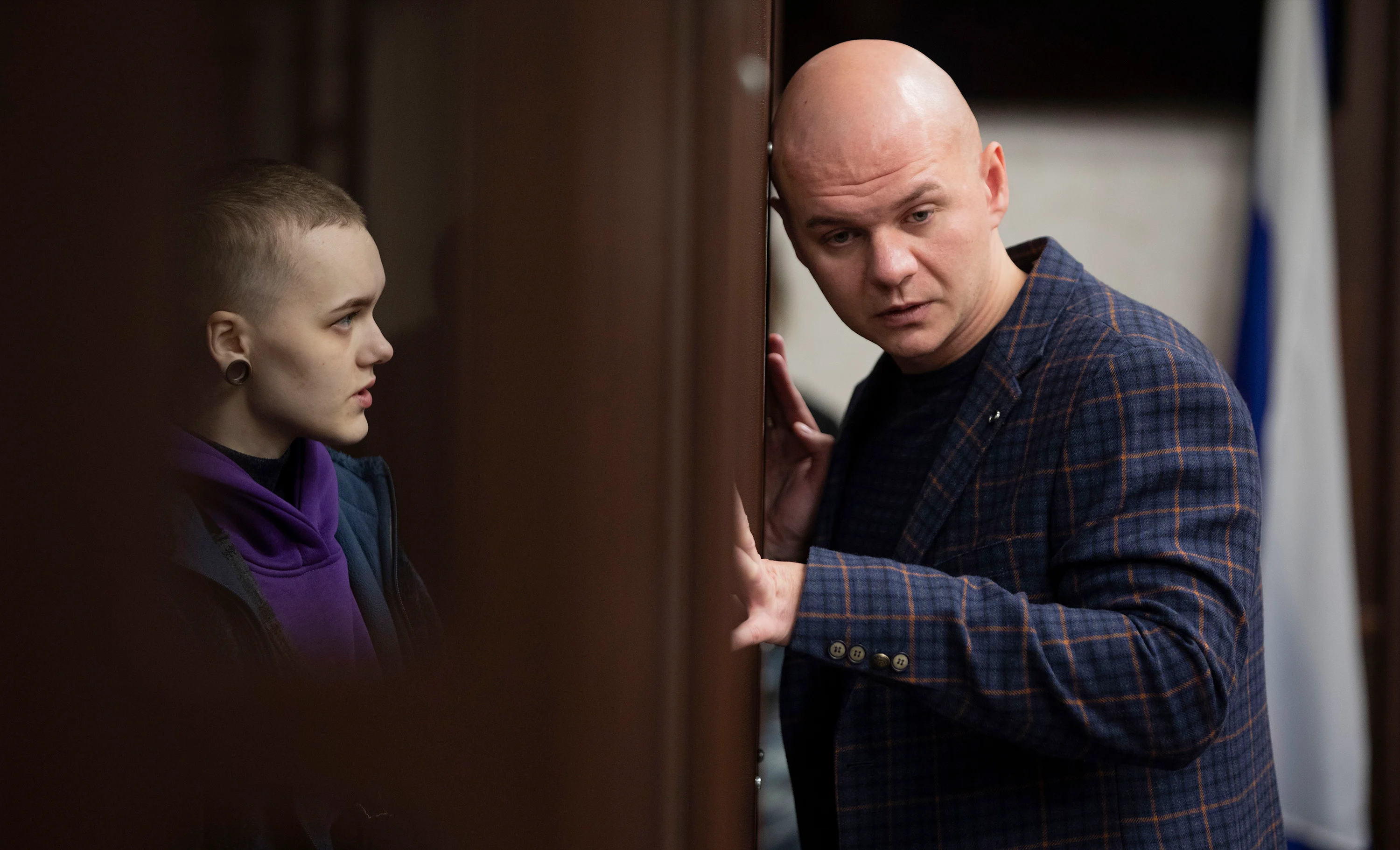 Iryna speaking with here attorney during a court hearing in Rostov. Photo: Alexandra Astakhova / Mediazona