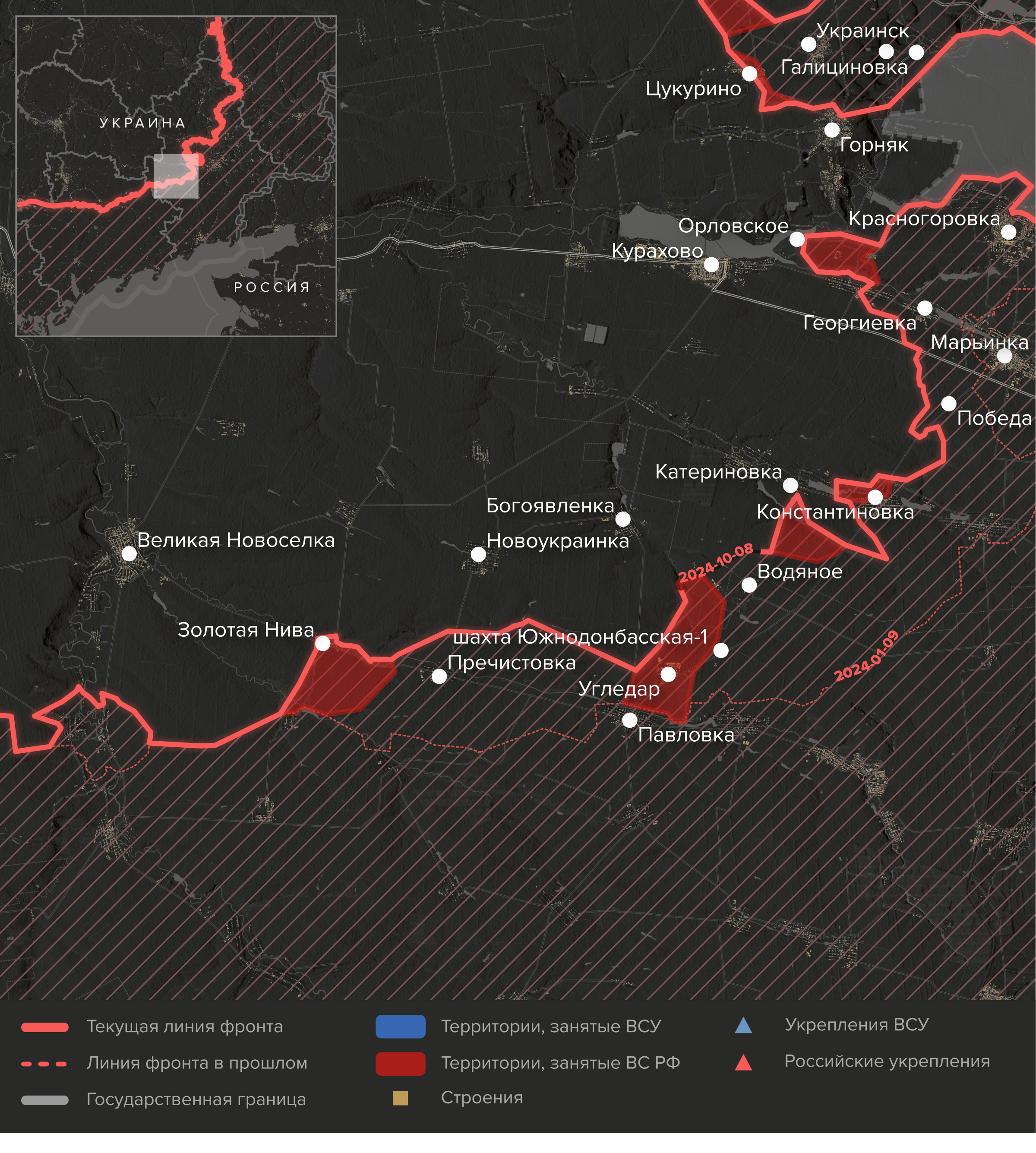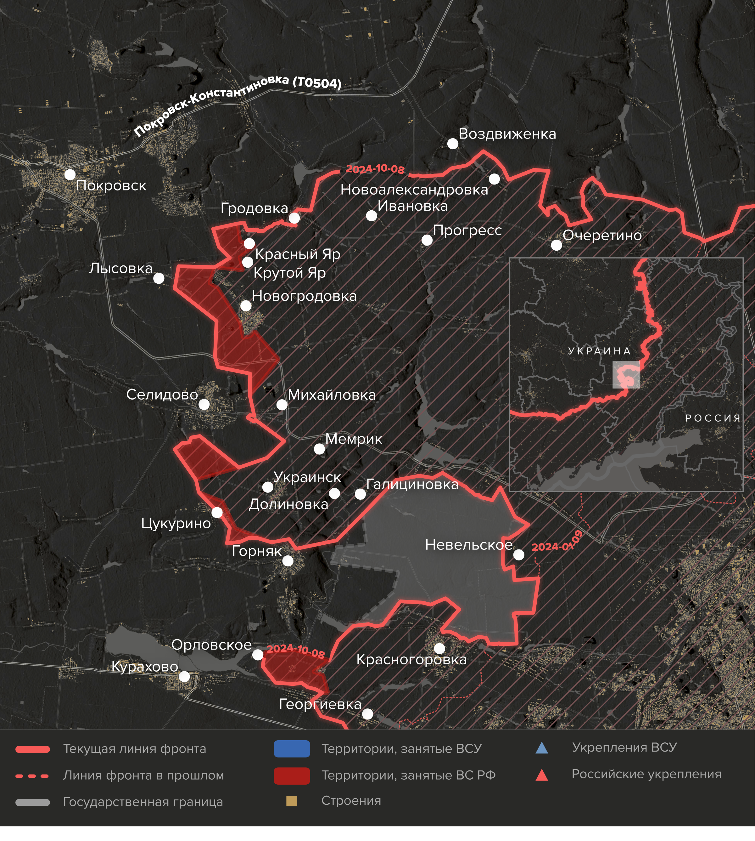 - Не вполне ясна судьба украинских войск, оборонявших обширный выступ между поселком Горняк и Донецком с важной позицией на высоте в районе села Невельского. Эта группировка мешала российской армии использовать для снабжения удобную трассу Донецк — Покровск. Если ВСУ сохраняют присутствие к востоку от Горняка (сам поселок уже штурмуют ВС РФ), то они находятся под угрозой окружения. Однако вероятнее, что украинские войска уже покинули выступ (но визуальных подтверждений этому нет).