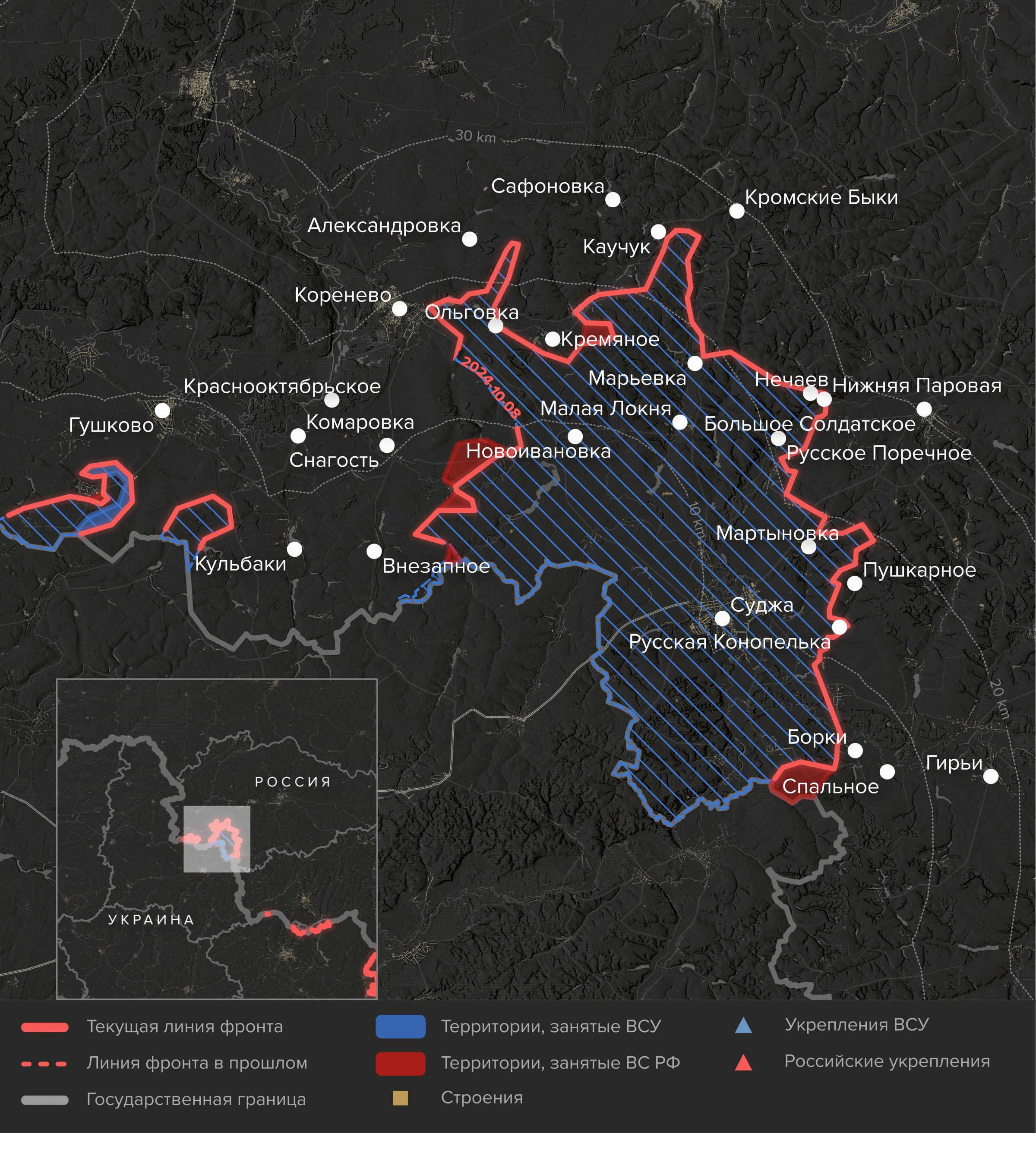 - Обе стороны достигли ограниченных тактических успехов. ВСУ обошли российский укрепрайон в селе Веселом, но не смогли его захватить. ВС РФ, которые были вынуждены бросить значительные силы на оборону Веселого, заняли часть села Любимовка, прикрывающего Суджу с запада, но пока не смогли прорваться дальше. К юго-востоку от Суджи российские войска, заняв Борки, пытались ворваться в соседнее село Плехово, но понесли большие потери в технике.