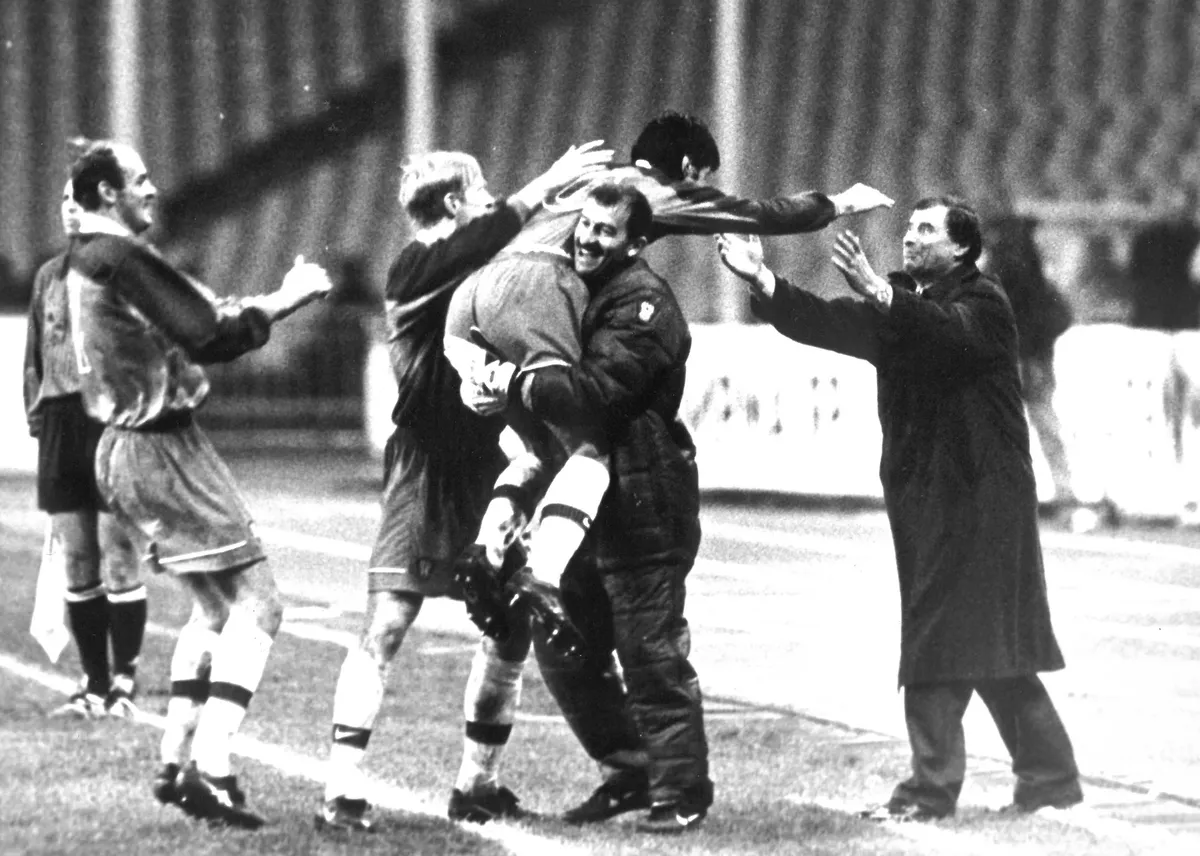 Впрочем, Хлестов держал, Хохлов бил (по воротам), а Валерий Карпин (он, замечу, с шестью мячами обернулся одним из лучших бомбардиров отборочного этапа) даже заколотил Шовковскому со штрафного. Шла 75-я дождливая минута. Фанаты в экстазе запустили в воздух полдюжины ракет. Команде оставалось дотерпеть всего ничего. И дотерпели бы, если бы не…