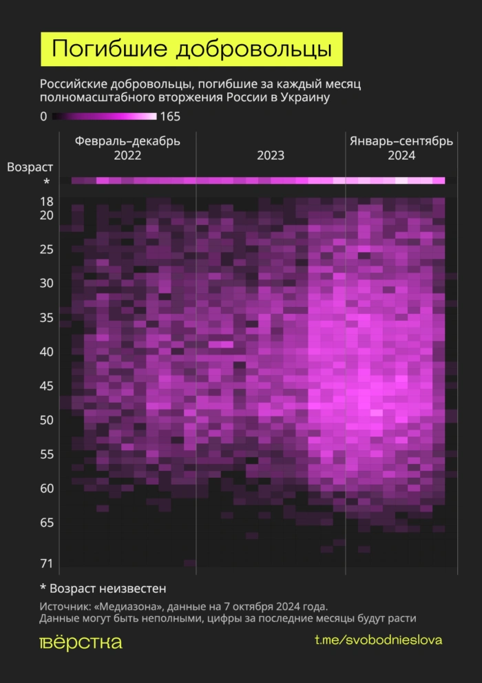 Заметно растёт и число убитых военных старше 55 лет. В текущем году, по данным «Медиазоны», их оказалось 597 человек — в полтора раза больше, чем в 2023 году (404 убитых старше 55 лет), и в четыре раза больше, чем в 2022 (152 погибших старше 55 лет). Самым старым оказался убитый в 2022 году 72-летний военнослужащий. Это житель Хабаровского края Михаил Шувалов, который после аннексии Крыма пытался отправиться служить добровольцем в «ДНР», а затем пошёл добровольцем на войну с Украиной.