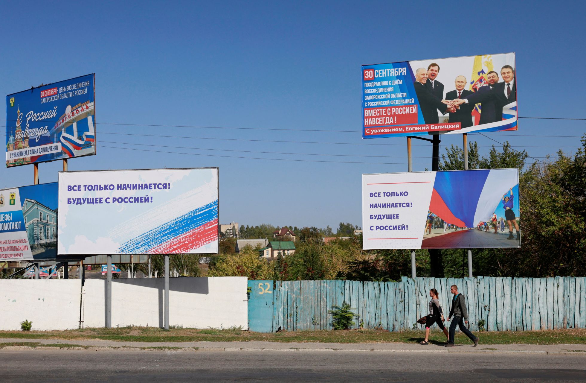Reuters / Scanpix / LETA В городе Мелитополе Запорожской области, который находится под контролем армии РФ с начала полномасштаной российско-украинской войны, на улицах вывесили пропагандистские билборды в честь так называемого «дня воссоединения» региона с Россией. Надписи на плакатах гласят: «Все только начинается!» и «С Россией навсегда!» 30 сентября 2022 года власти РФ объявили о формальной аннексии территорий Донецкой, Луганской, Херсонской и Запорожской областей Украины, которые оккупированы российской армией.