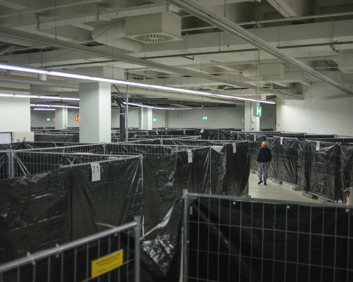Виталия с женой и дочкой поселили в заброшенном двухэтажном супермаркете. О торговле здесь теперь напоминают только траволаторы, по которым когда-то немцы ездили с этажа на этаж с тележками, а теперь беженцы ходят в туалет и на кухню. Охранниками здесь работают в основном чернокожие, что Виталию очень не нравится: