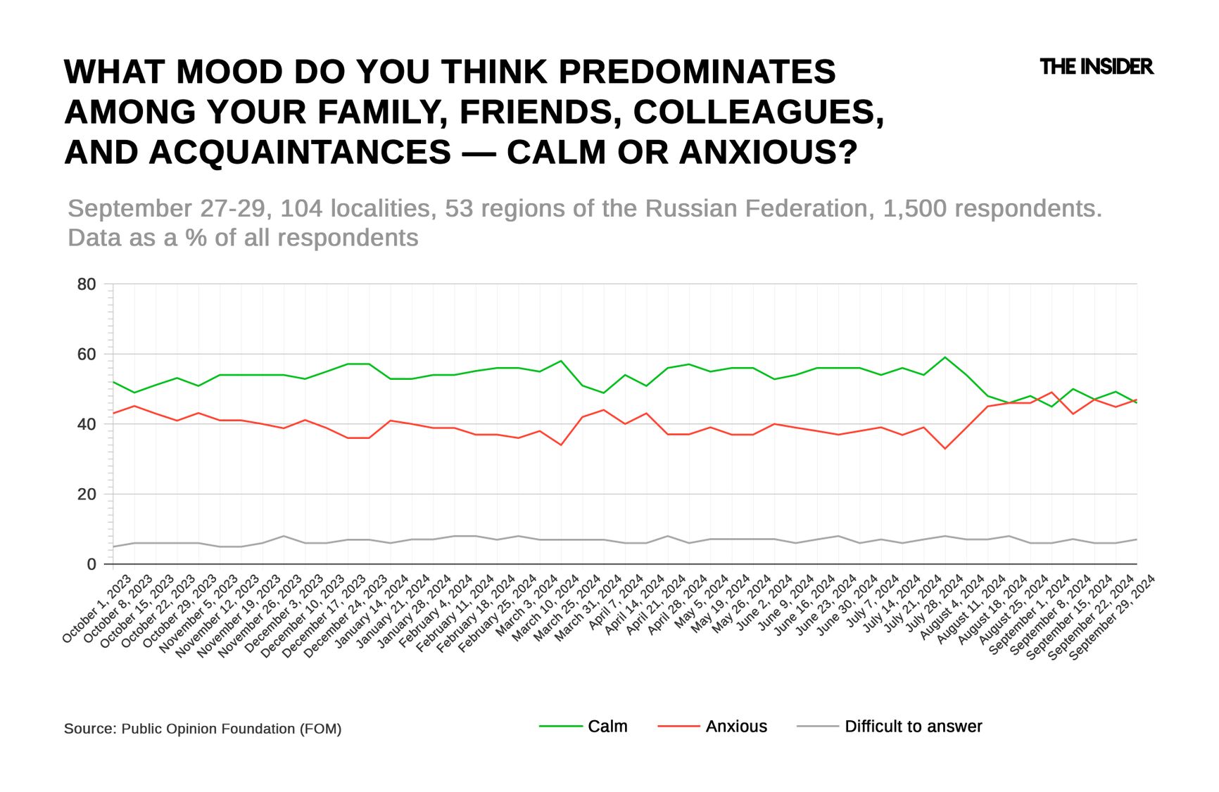Throughout the past year, calm individuals consistently outnumbered the anxious. The two curves began to converge at the end of March 2024 following the terrorist attack at Crocus City Hall: 44% anxious and 49% calm. Thus, the feelings around Kursk turned out to be worse than those caused by Crocus City, but far less dire than what was felt during mobilization.