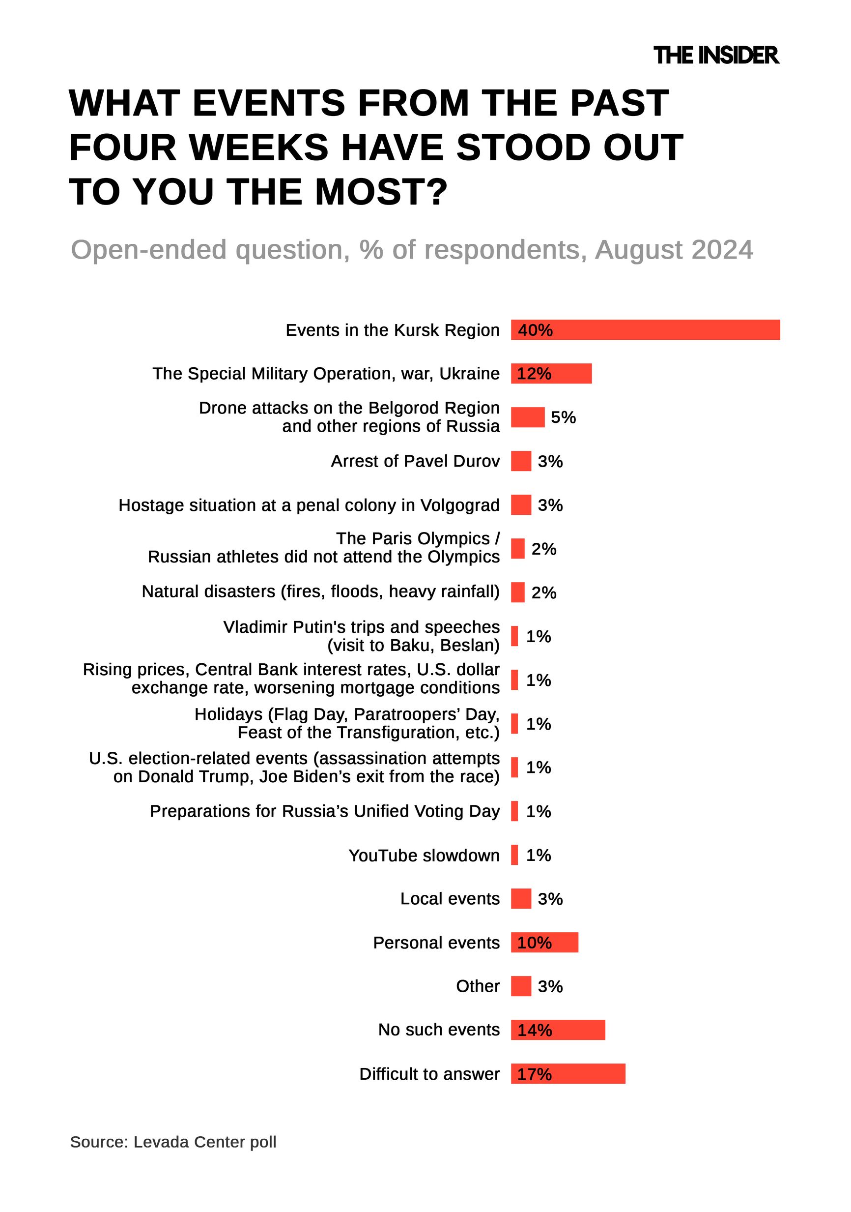 In Levada's ranking of events for August, Kursk was in first place with 40%, while the “SMO” (“war,” “Ukraine”) received 12% overall. Data for September has not yet been published.