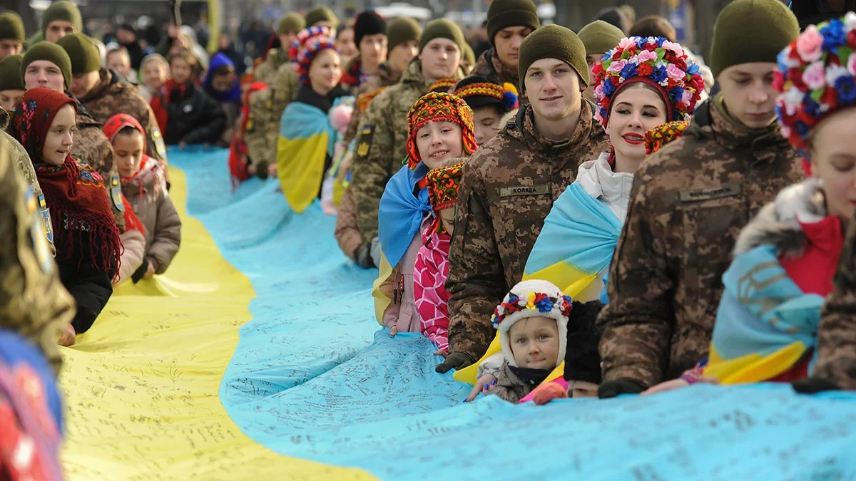 Locals carry a giant national flag signed by some 1,447 Ukrainian troops through the western Ukrainian city of Lviv, January 2024. Photo: EPA-EFE/MYKOLA TYS