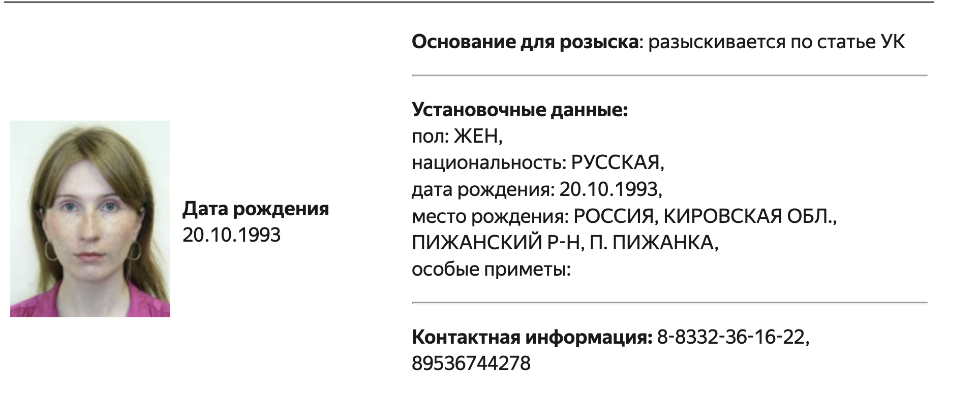 В карточке розыска Барановой указан номер управления МВД по Кирову. В базу ведомства она была добавлена не позднее 24 сентября. Как рассказала «Медиазоне» сама журналистка, уголовное дело против нее, вероятно, возбудили по статье о нарушении закона об «иностранных агентах» (статья 330.1 УК).