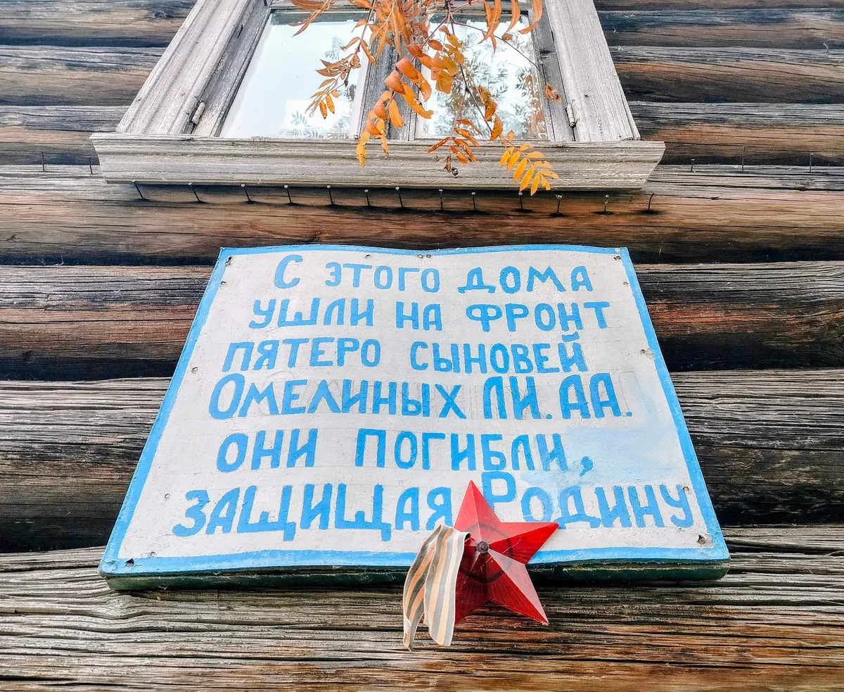 На фасаде разваливающегося здания висит лишь самодельная мемориальная доска, которую установили жители деревни: «С этого дома ушли на фронт пятеро сыновей Омелиных Л.И. и А.А. Они погибли, защищая родину». Кстати, один из сыновей Омелиных — Василий — погиб еще на финской войне, в 1939 году.