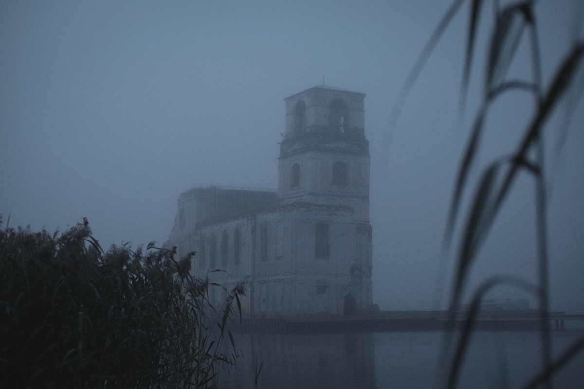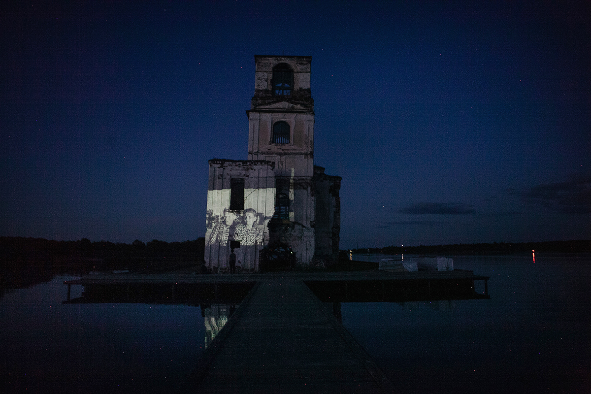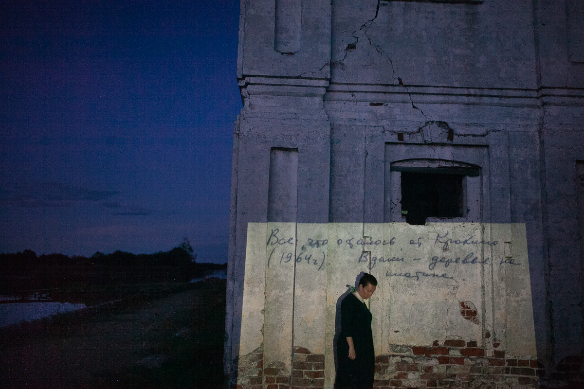 Анор у храма. На стене — проекция надписи с оборота фотографии из архива жителей села Крохино. Надпись «Все, что осталось от Крохино (1964). Вдали — деревья на плотине»
