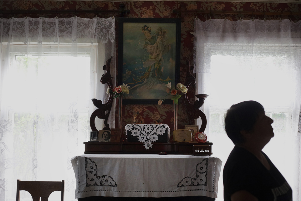 Татьяна Павловна Петрова (в девичестве Петухова) в доме, который ее семья перевезла из Крохина. Мебель также перевезена из Крохина. На комоде рама, раньше в ней было зеркало. После того как оно разбилось, его заменили портретом Сталина. Татьяна Павловна рассказывает, что ей казалось, будто он смотрит за ней в разных углах комнаты