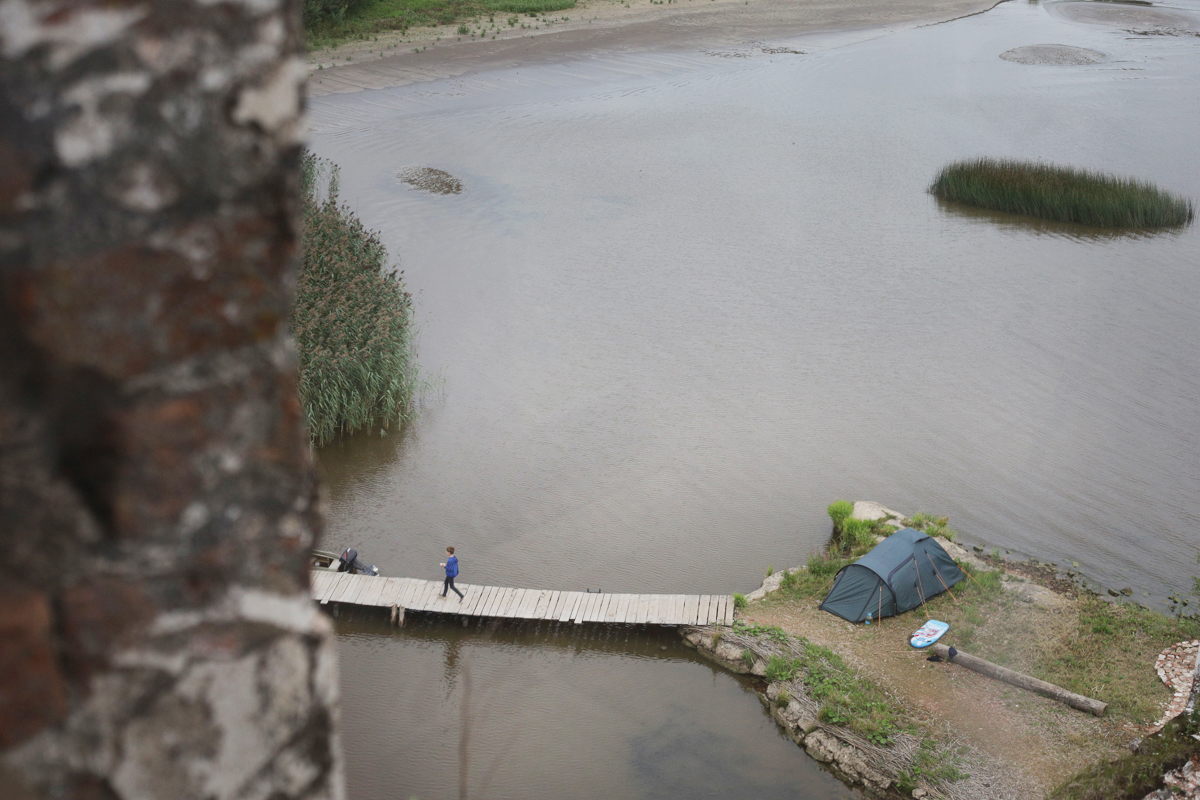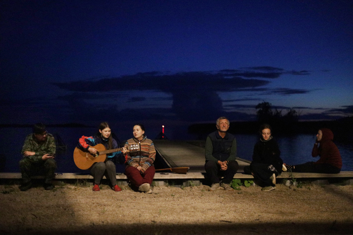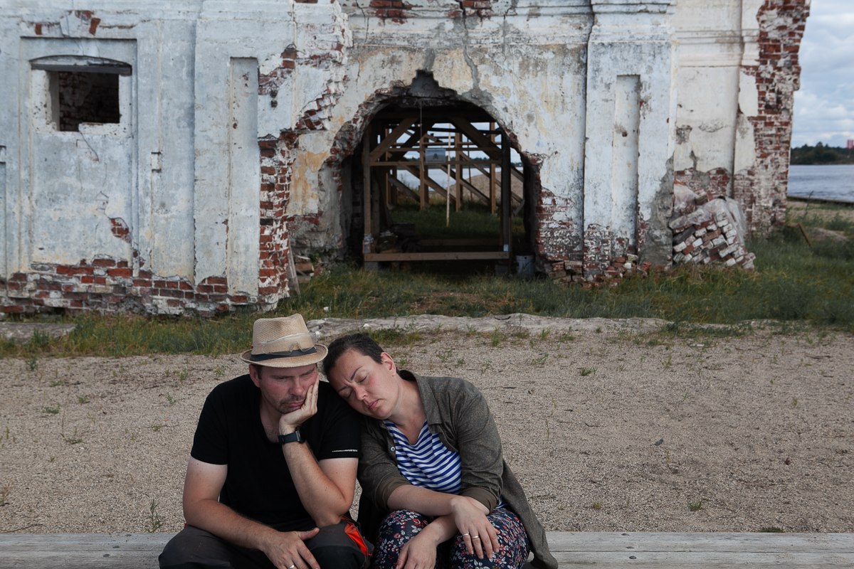 Илья и Анор отдыхают у храма. В сезон навигации, с апреля по ноябрь, когда идут работы по консервации храма, у них нет выходных