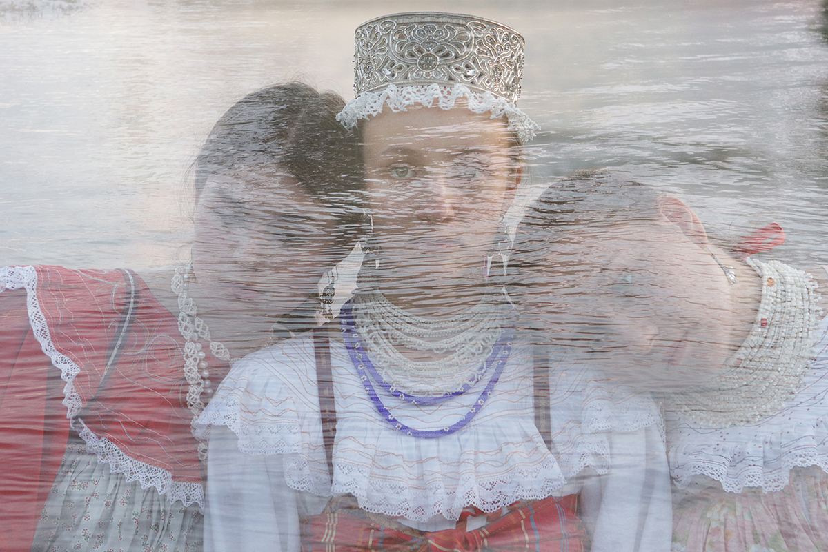 Слева направо: волонтерки Дуня, Саша и Яна в рекнструированных крохинских костюмах невесты и ее подружек