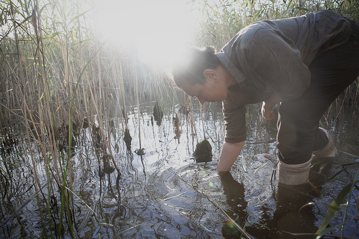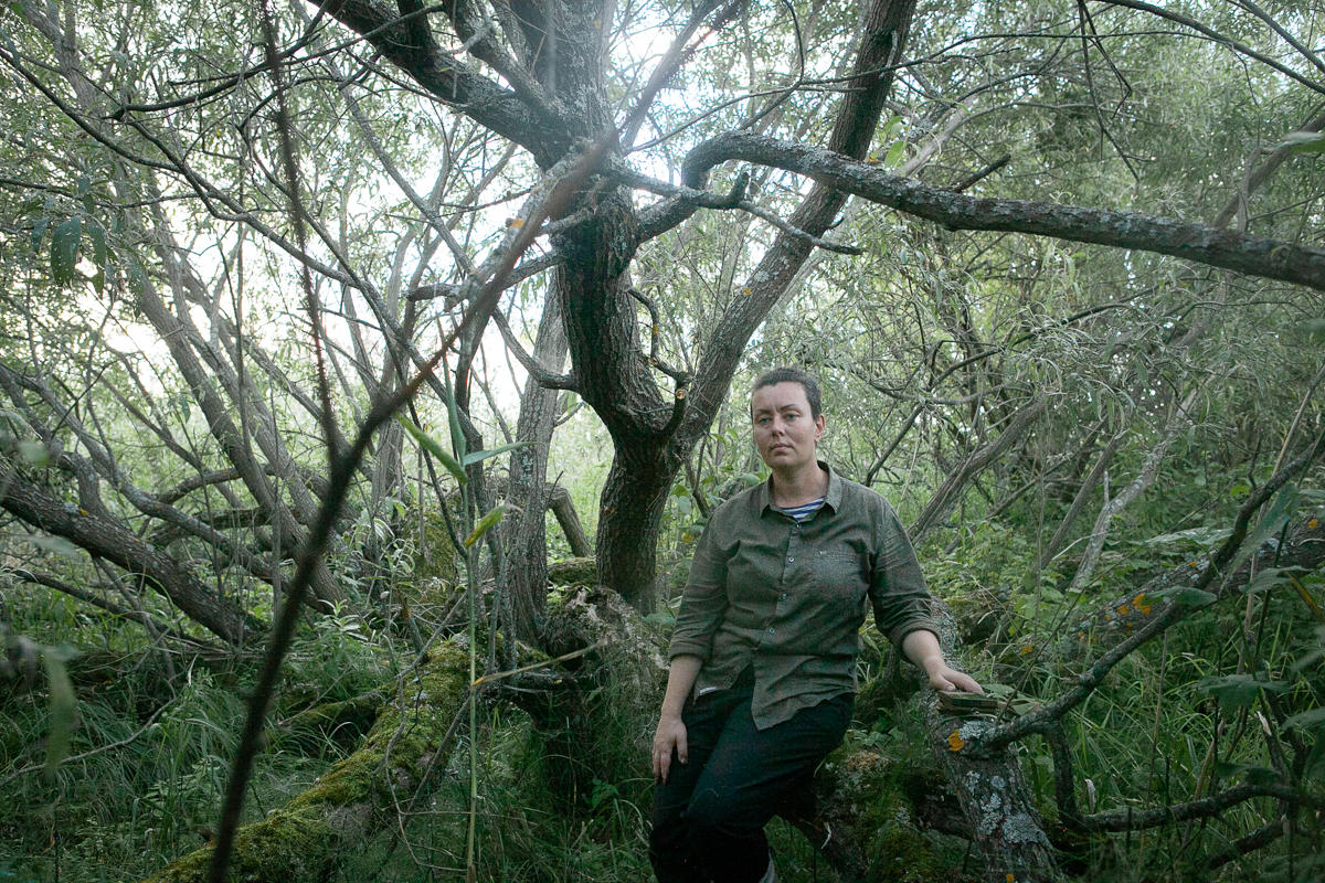 Анор Тукаева у старой ивы, которую прозвали «папа-дерево». Анор приглашала биологов, которые подсчитали, что примерный возраст дерева — 60 лет. Скорее всего, это первое дерево, которое выросло в зоне затопления, зацепившись за фундамент разрушенного дома. В его корнях Анор и волонтеры фонда находят артефакты — предметы быта, которые принадлежали жителям Крохина