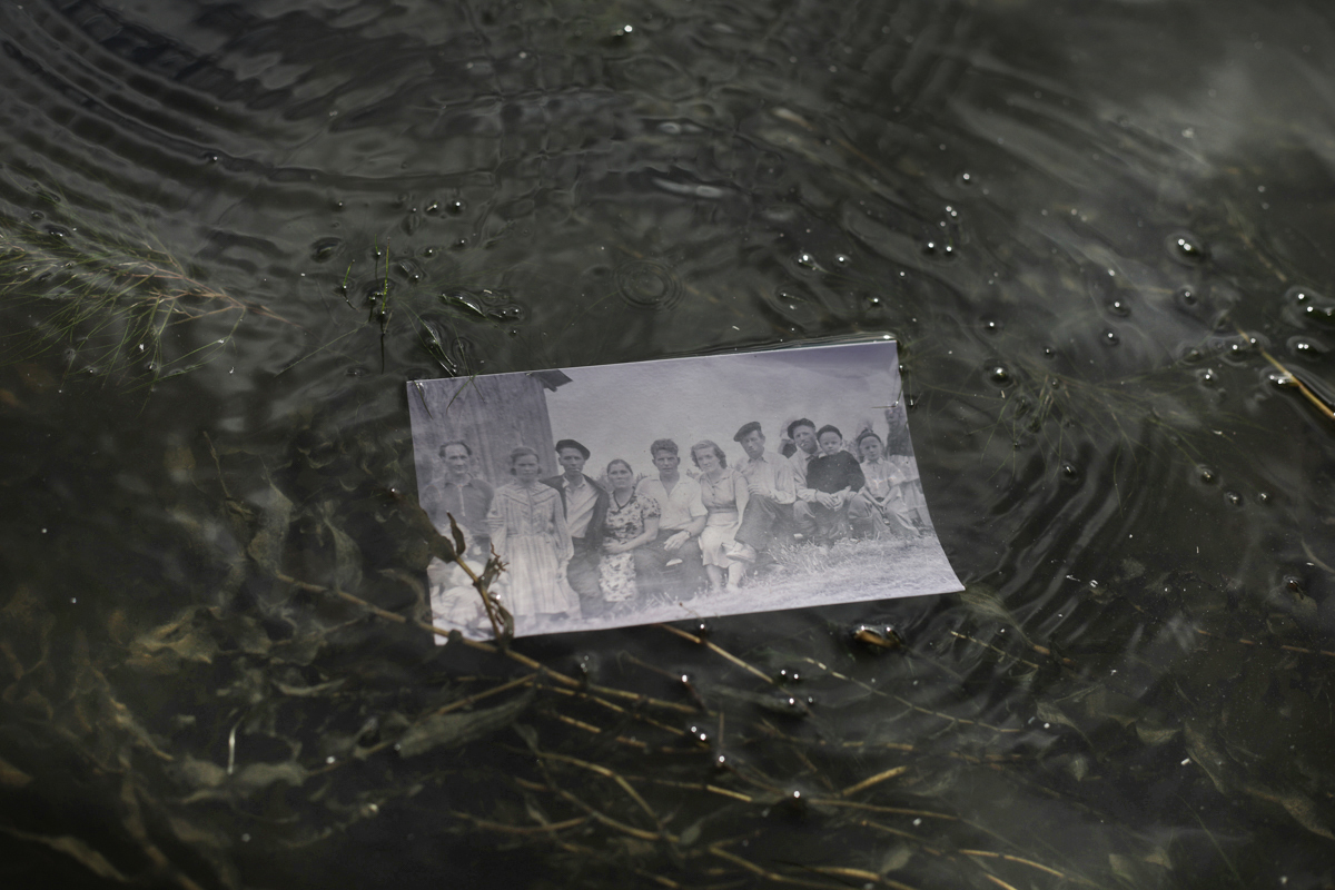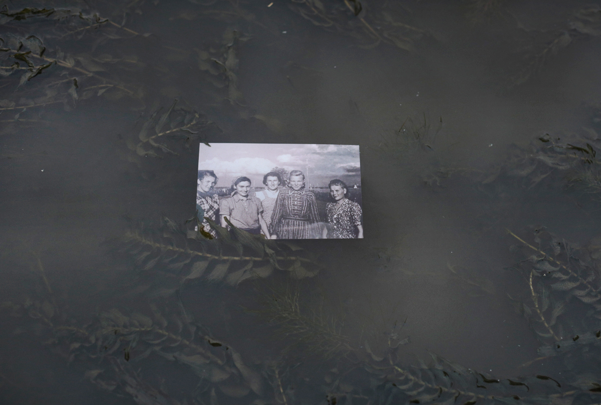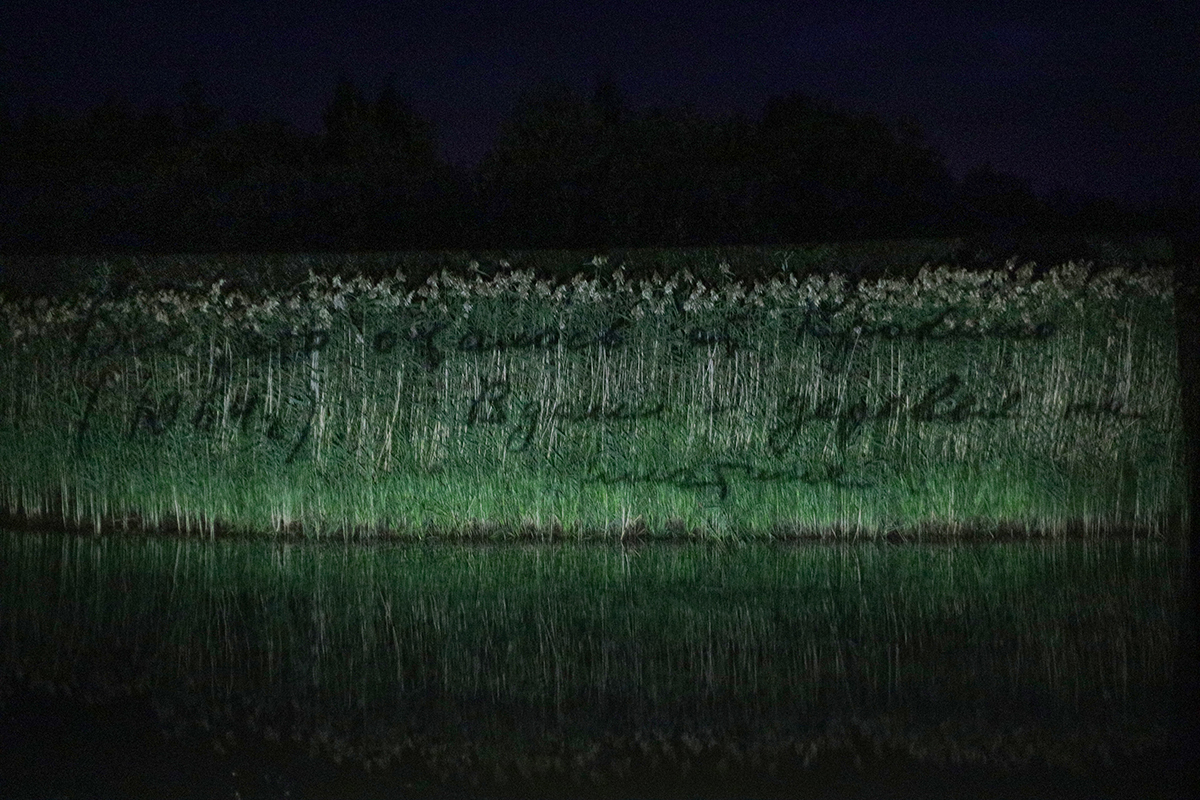 Проекция надписи с оборота фотографии из архива жителей села Крохино на тростнике у берега. «Все, что осталось от Крохино (1964). Вдали — деревья на плотине»