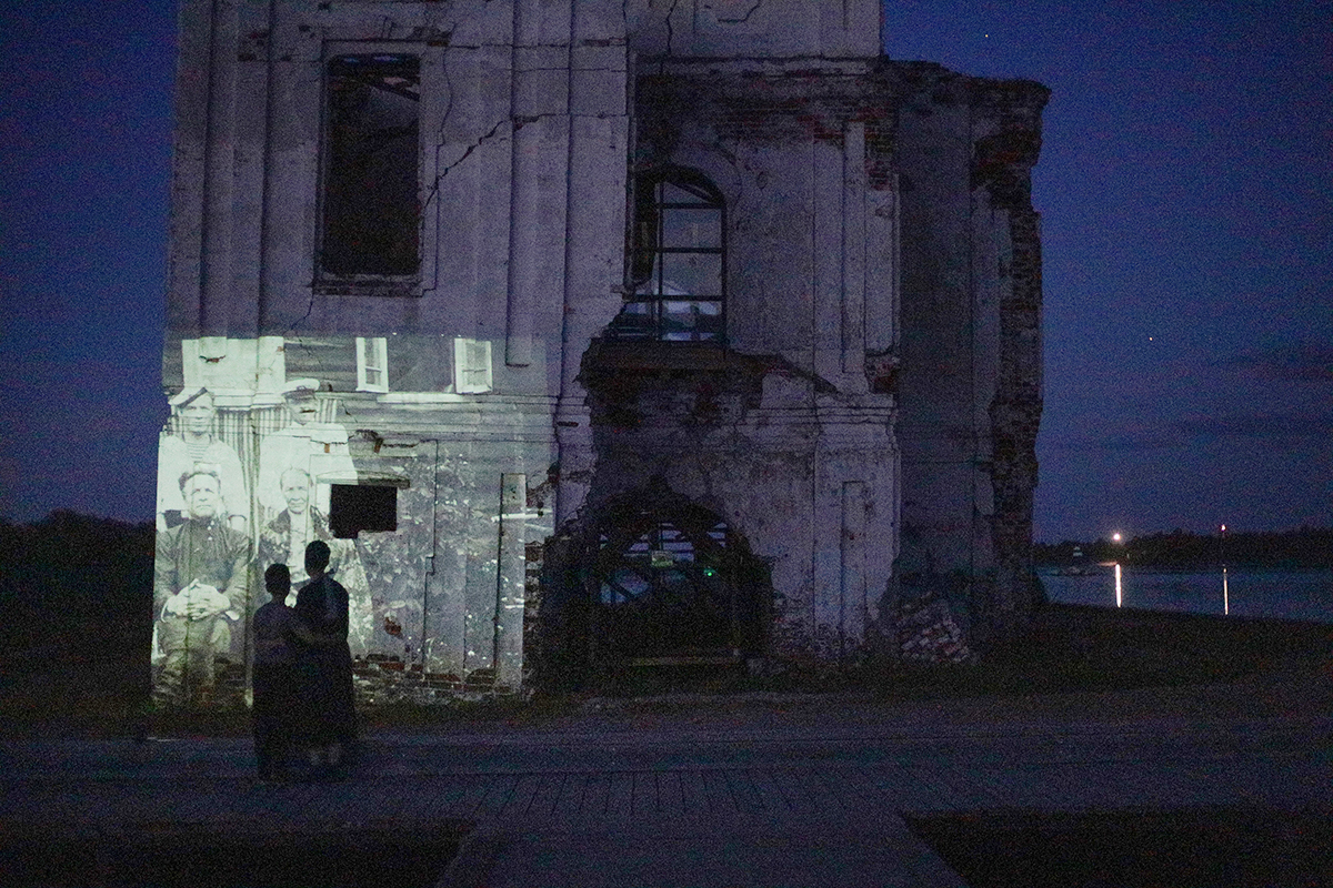 Проекция фотографии из архива жителей Крохина на стену храма