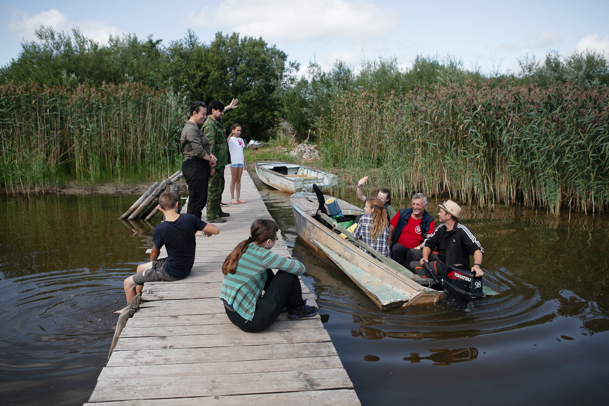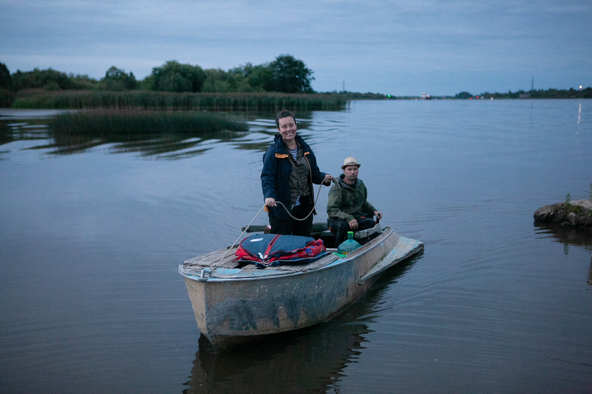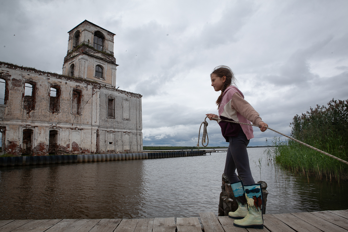 Ева, племянница Виталия Крутицкого, одного из волонтеров, помогает пришвартовать лодку, она приезжает в Крохино уже второй раз