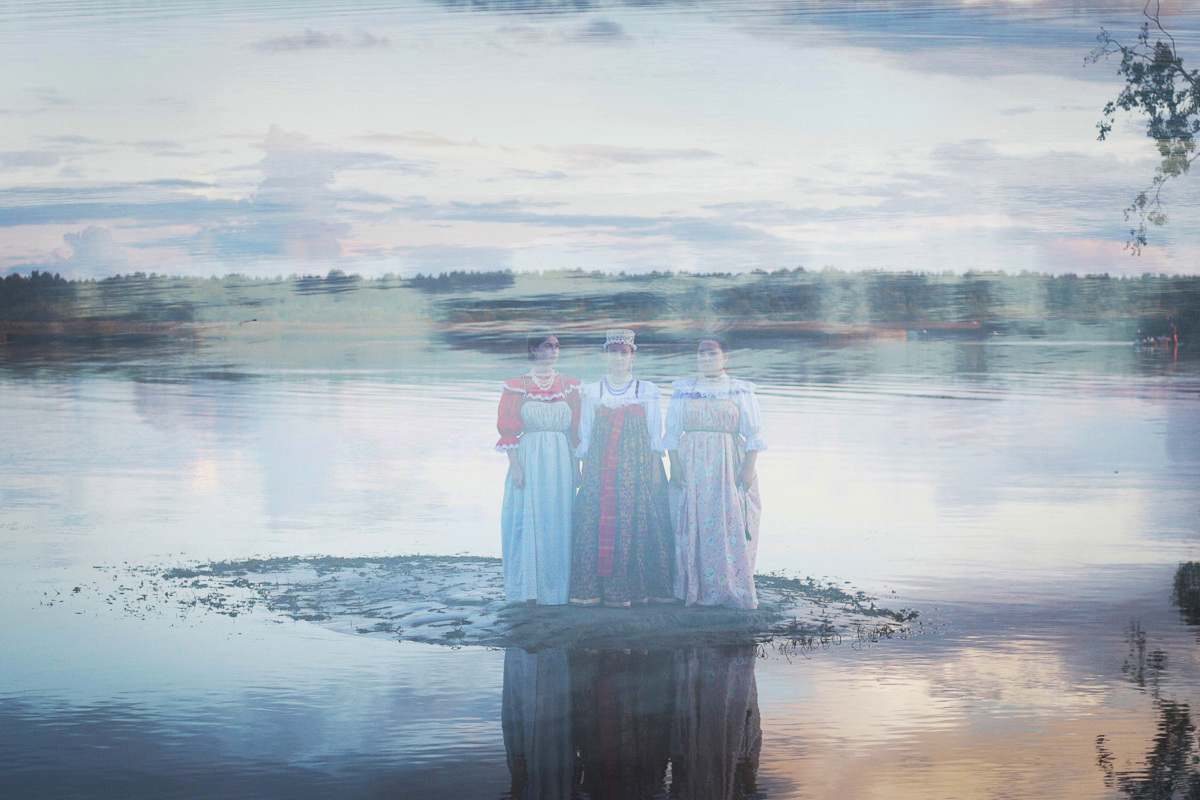 Слева: Дуня и Яна в реконструированных костюмах подружек невесты. В центре: Саша в реконструированном костюме невесты. Справа: Дуня и Яна в реконструированных костюмах подружек невесты