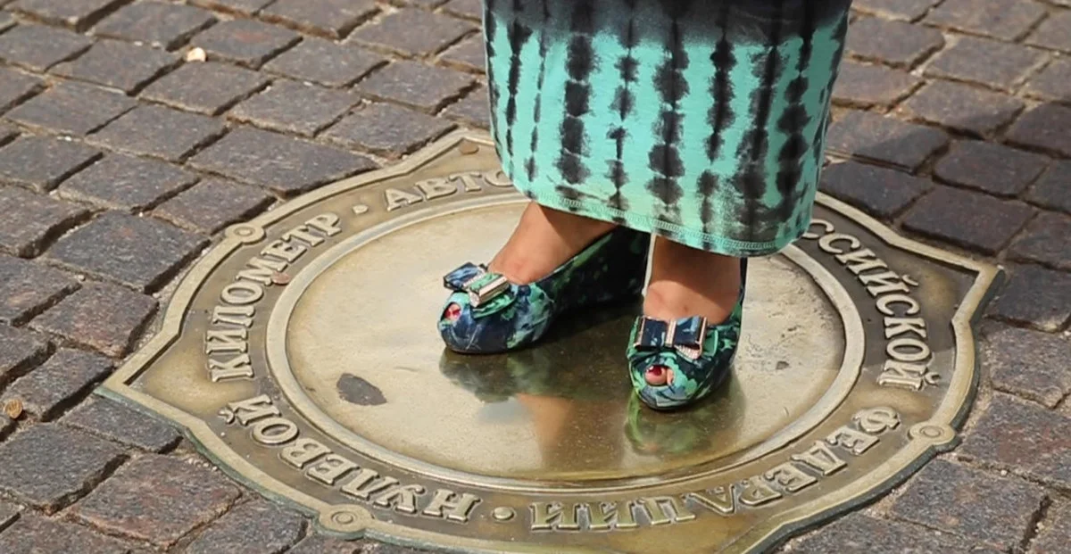 Камера смотрит на нулевой километр российской Федерации. Тот, что у Воскресенских ворот: квадрат с изображением знаков Зодиака и сторон света. Тут всегда многолюдно: туристы бросают монетку на желание, находчивые дети и взрослые «работники» эти монетки собирают. Правда, видим мы не самих людей. Только ноги.