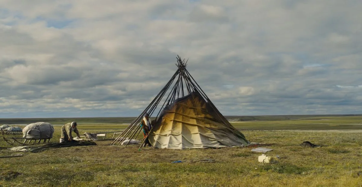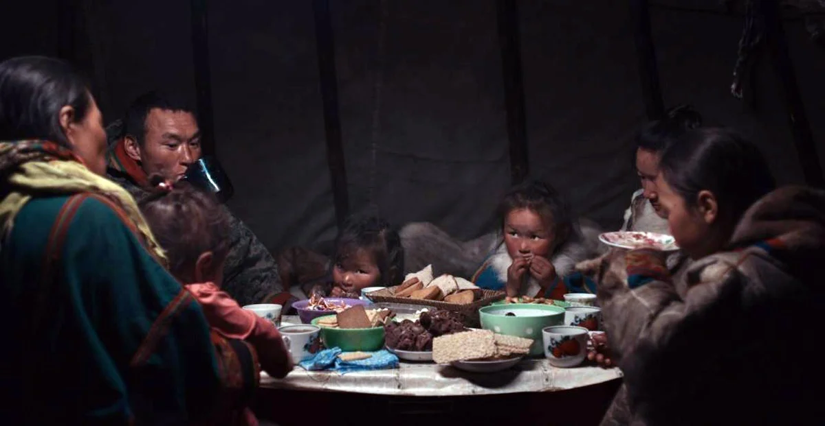 Одна из самых ужасных сцен для нашего урбанистического взгляда: режут молодого оленя, приговаривая: «надо шкуру снимать, пока живой». Олень в камеру смотрит. Невыносимо. Дети и взрослые едят сырое мясо руками, руки и губы в крови, так принято. Собирают морошку. Делают уроки. А на ночь мама рассказывает Нике сказку, тихонько постукивая ее по спине, чтобы заснула. Очень красивая сказка про девочку-мышь и птицу — с повторами: похоже на старинный заговор. Нике тепло. И ей не страшен ветер за стенами чума, укрытого шкурами оленей.