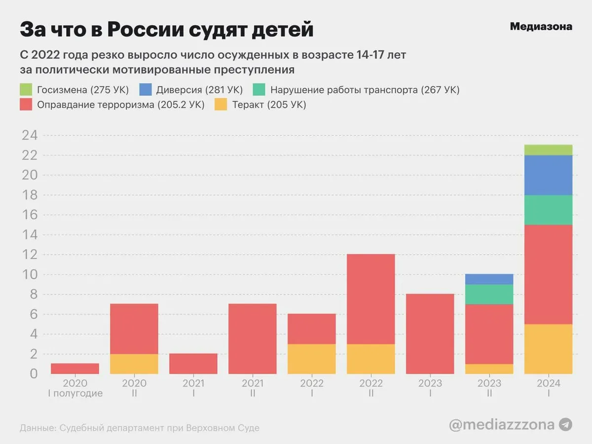 До начала войны в Украине в отношении школьников выносили меньше десяти приговоров по статьям о госизмене, диверсии, нарушении работы транспорта, оправдании терроризма и теракте за одно полугодие. В первой половине 2024 года таких приговоров было вынесено уже 23.