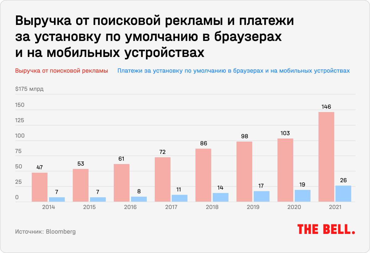 Точный размер платежей в последние годы неизвестен. Но эксклюзивные соглашения позволили Google поднимать расценки и получить больше $175 млрд выручки в прошлом году от поисковой рекламы.