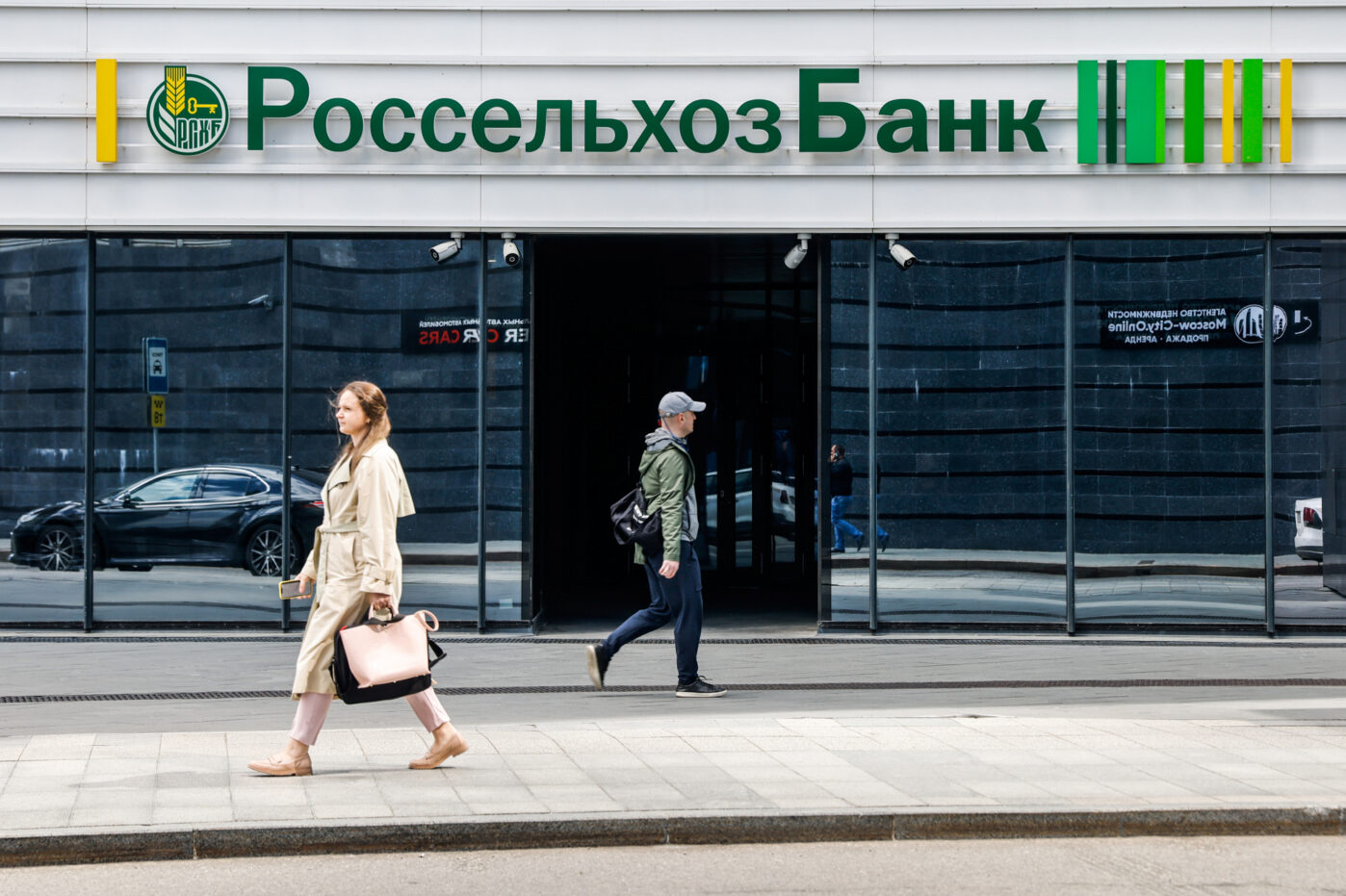 Прохожие идут мимо входа в филиал Россельхозбанка в Москве, 25 мая 2022 года. Фото: Maxim Shemetov/Reuters.