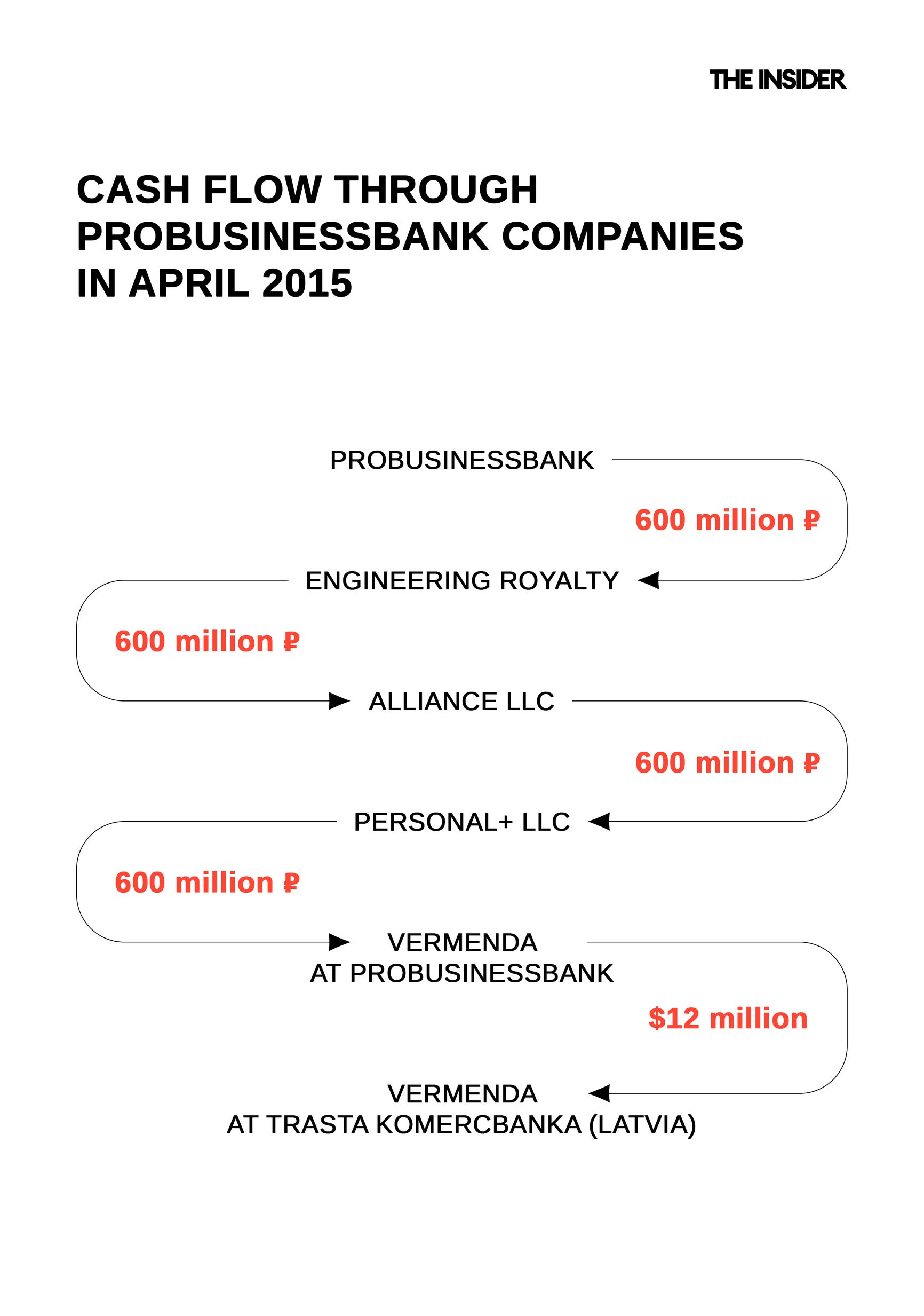 3. “Probusinessbank extends a loan of 600 million rubles to the company Engineering-Royalty. On the same day, this sum is transferred from the Engineering-Royalty account to the account of Alliance LLC. On the same day, the same amount is transferred from Alliance to the account of Personnel+ LLC. And on the same day, the same amount goes to Vermenda. From Vermenda's account at Probusinessbank, $12 million is then transferred to its account in Latvia at the notorious Trasta komercbanka.”