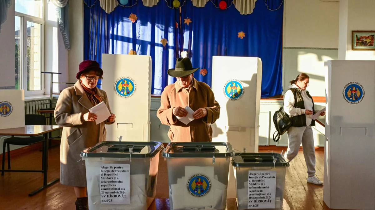 Избиратели опускают бюллетени, голосуя на президентских выборах и референдуме в селе Гирбоват, Молдова, 20 октября 2024 года. Фото: Daniel Mihaelescu / AFP / Scanpix / LETA