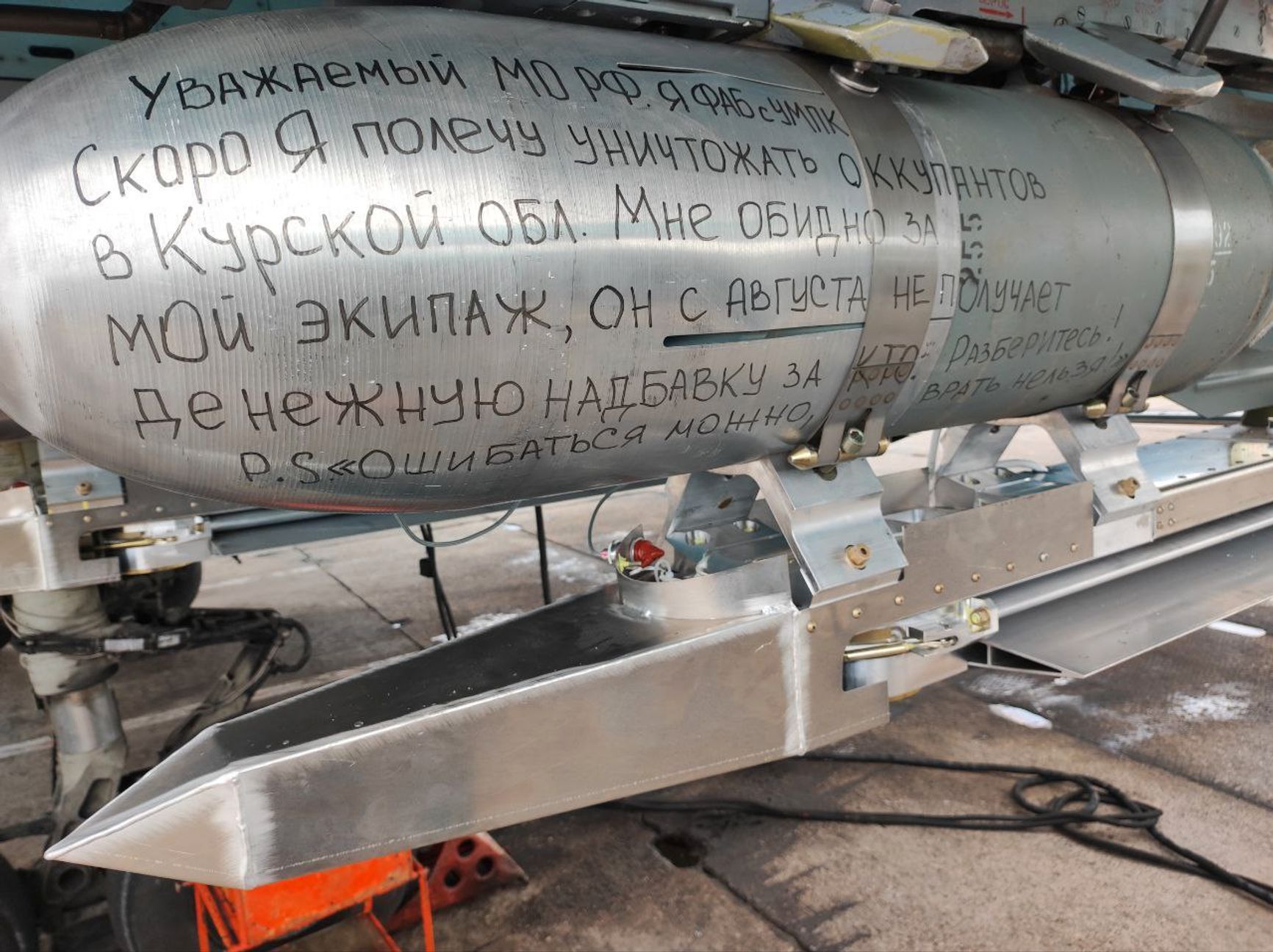 Российские летчики направили жалобу в Минобороны РФ о невыплате надбавок за участие в «контртеррористической операции» в Курской области экстравагантным способом — написав ее фломастером на ФАБ с УМПК и послав снимок автору канала Fighterbomber. Судя по тому, что «оружие победы» (авиабомба) заканчивает «свое» послание словами «Ошибаться можно, врать нельзя», адресовано оно конкретно министру обороны Андрею Белоусову — автору этой крылатой фразы.