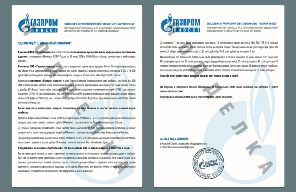 «Газпром» даже выпустил отдельное заявление на собственном сайте. В нем представители компании писали, что участились случаи, когда к ним обращались люди, узнавшие о «проекте» в интернете и желавшие вложить личные средства. Там же говорилось, что «лица, осуществляющие попытки под этими предлогами привлечь денежные средства физических лиц, являются мошенниками», а также что «Газпром» не обладает лицензией форекс-дилера.