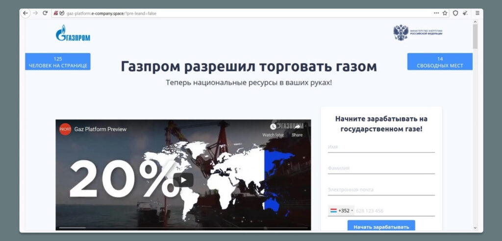 Помимо Илона Маска, в российском сегменте ютуба вирусились рекламные ролики якобы государственной корпорации «Газпром» с примерно таким же содержанием. В них утверждалось, что Госдума в 2019 году приняла закон, разрешающий торговать газом всем гражданам. Ссылки под ними вели на мошеннические сайты, а в App Store и Google Play Market даже появились приложения, имитирующие подразделение Газпромбанка «Газпром Инвестиции».