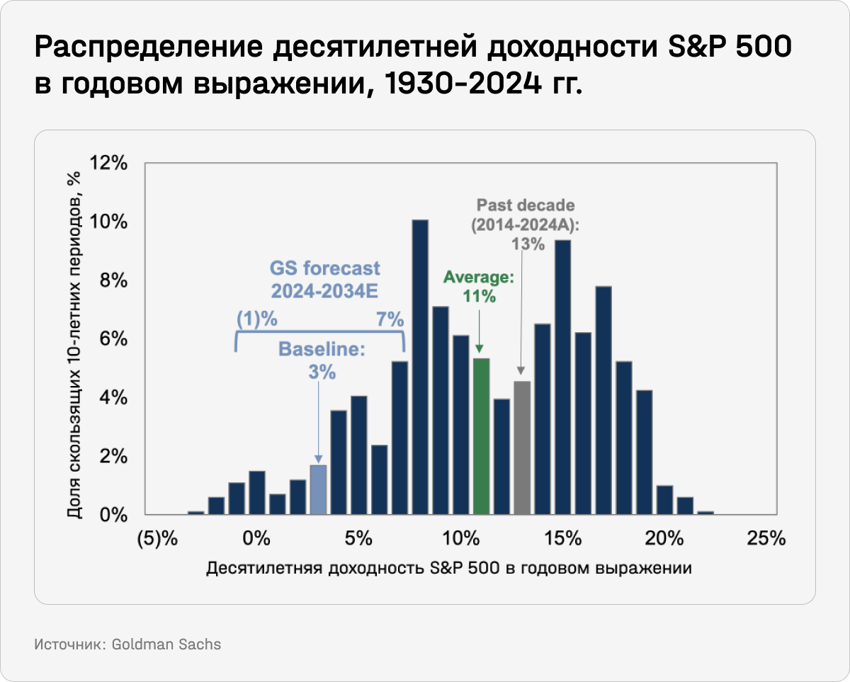 На этой недели много шума наделал отчет Goldman Sachs, из которого следует, что десятилетие быстрого роста американского рынка акций едва ли повторится. Аналитики банка во главе с одним из самых заметных стратегов Уолл-стрит Дэвидом Костиным подсчитали, что в ближайшие 10 лет среднегодовая номинальная доходность S&P 500 в базовом сценарии составит всего 3% в год, а реальная, то есть с учетом инфляции, — всего 1%. Это может стать одним из худших в истории отрезков в 10 лет с точки зрения доходности.