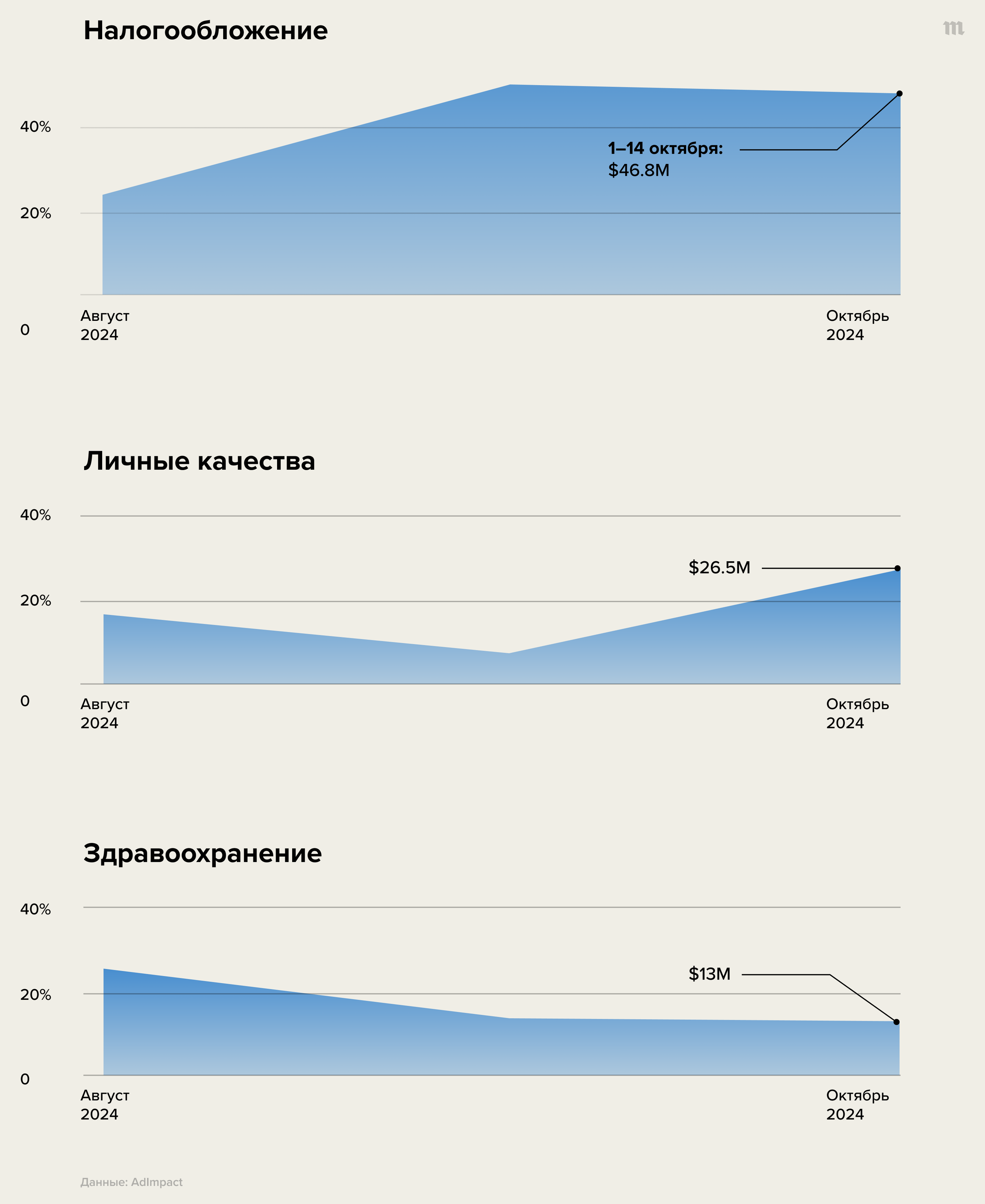 Среди тем, которые чаще всего в рекламных роликах упоминает штаб Харрис, — налогообложение, личные качества кандидатов и здравоохранение.
