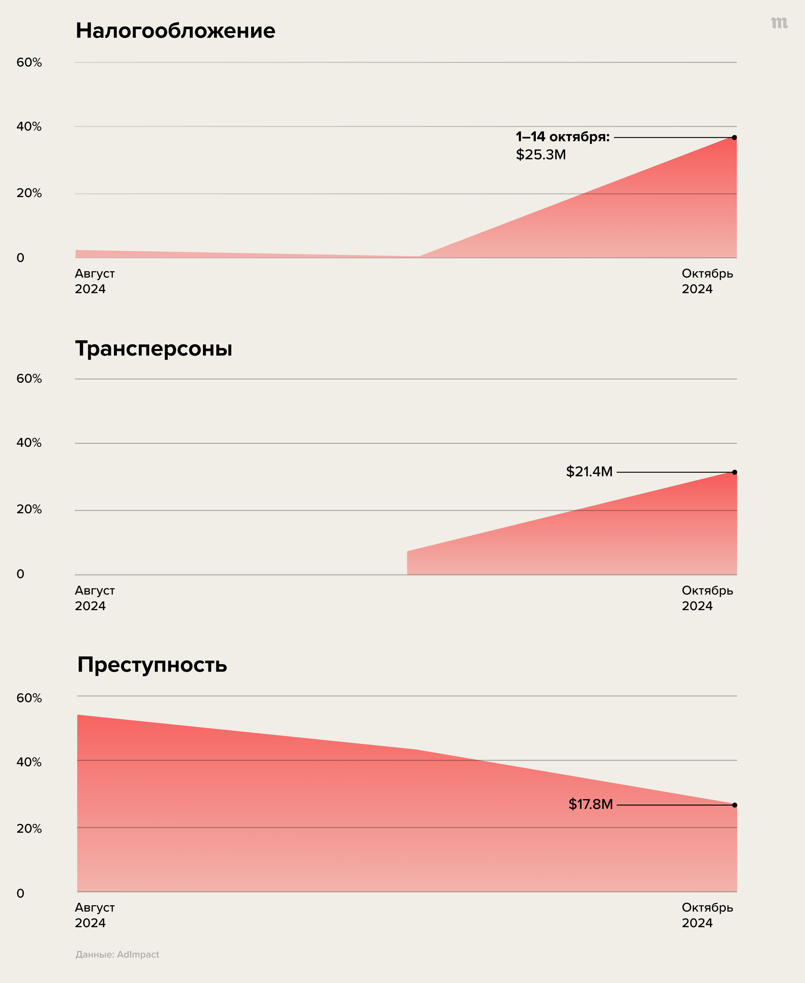Впрочем, кампании постоянно меняют свой фокус, и темы роликов разнятся от недели к неделе. Проведенный CNN анализ показывает, что в октябре штаб Трампа почти отказался от темы миграции в своей рекламе, зато стал намного чаще упоминать налоги и трансперсон.