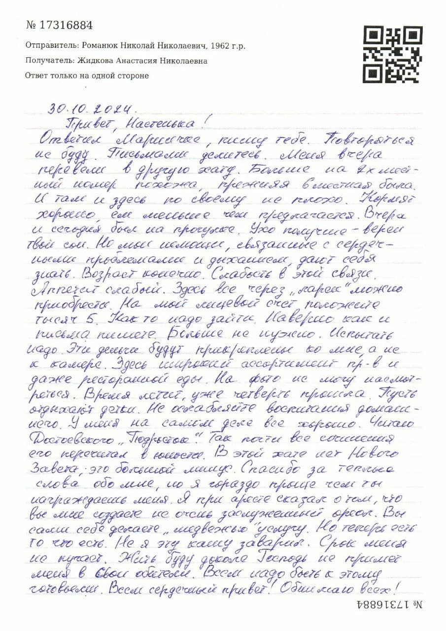 В конце октября на закрытом заседании Балашихинский суд Московской области отправил в СИЗО (для начала до 16 декабря) старшего пастора пятидесятнической церкви Святой Троицы Николая Романюка. Прихожан и родственников арестованного на заседание не пустили, присутствовал лишь адвокат, от которого верующие узнали, что пастор будет содержаться в СИЗО № 11 подмосковного Ногинска. Согласно электронному «Справочнику тюрем РФ», заведение это пользуется дурной репутацией: камеры отапливаются плохо, почта доходит не всегда, а передачи — не полностью… Романюку вменяют преступление, предусмотренное ст. 280.4 УК РФ — «Публичные призывы к осуществлению деятельности, направленной против безопасности государства». Ему грозит до семи лет лишения свободы.
