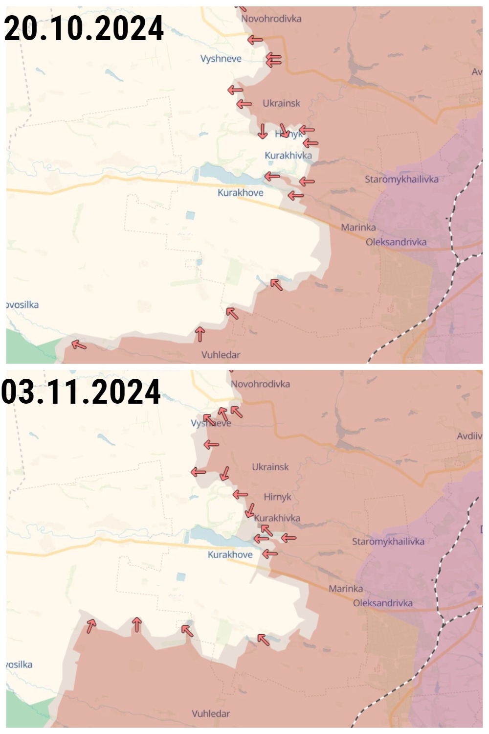 Теперь российская армия наступает на Курахово с севера, пытаясь обогнуть Кураховское водохранилище и взять северную часть города под огневой контроль. Это, по мнению украинского военнослужащего, который ведёт телеграм-канал "Говорять Снайпер", сильно усложнит оборону Курахова. ВС РФ также наступают на город с востока со стороны Марьинки и с юга – со стороны Угледара: там российские войска, судя по направлению их атак, стремятся выйти в тыл ВСУ через Андреевку и Константинополь, расположенных западнее Курахова.