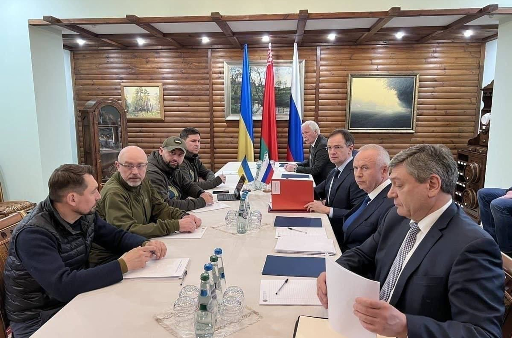 Замглавы МИДа Украины Николай Точицкий, министр обороны Алексей Резников, глава фракции «Слуга народа» Давид Арахамия и советник главы Офиса президента Михаил Подоляк, а также представители РФ, включая помощника президента Владимира Мединского, на переговорах 7 марта 2022 года