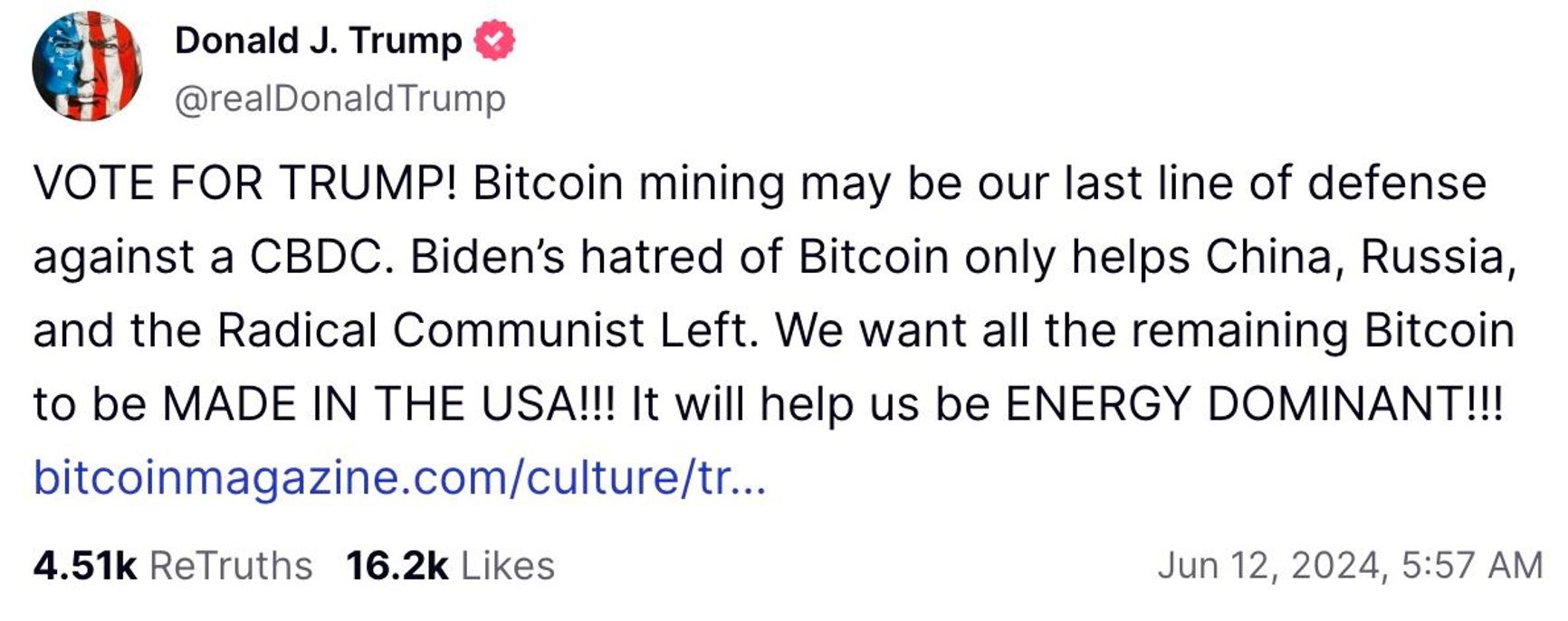 “Bitcoin mining may be our last line of defense against a CBDC [central bank digital currency]. Biden’s hatred of Bitcoin only helps China, Russia, and the Radical Communist Left. We want all the remaining Bitcoin to be MADE IN THE USA!!! It will help us be ENERGY DOMINANT!!!” the 77-year-old presidential candidate posted.