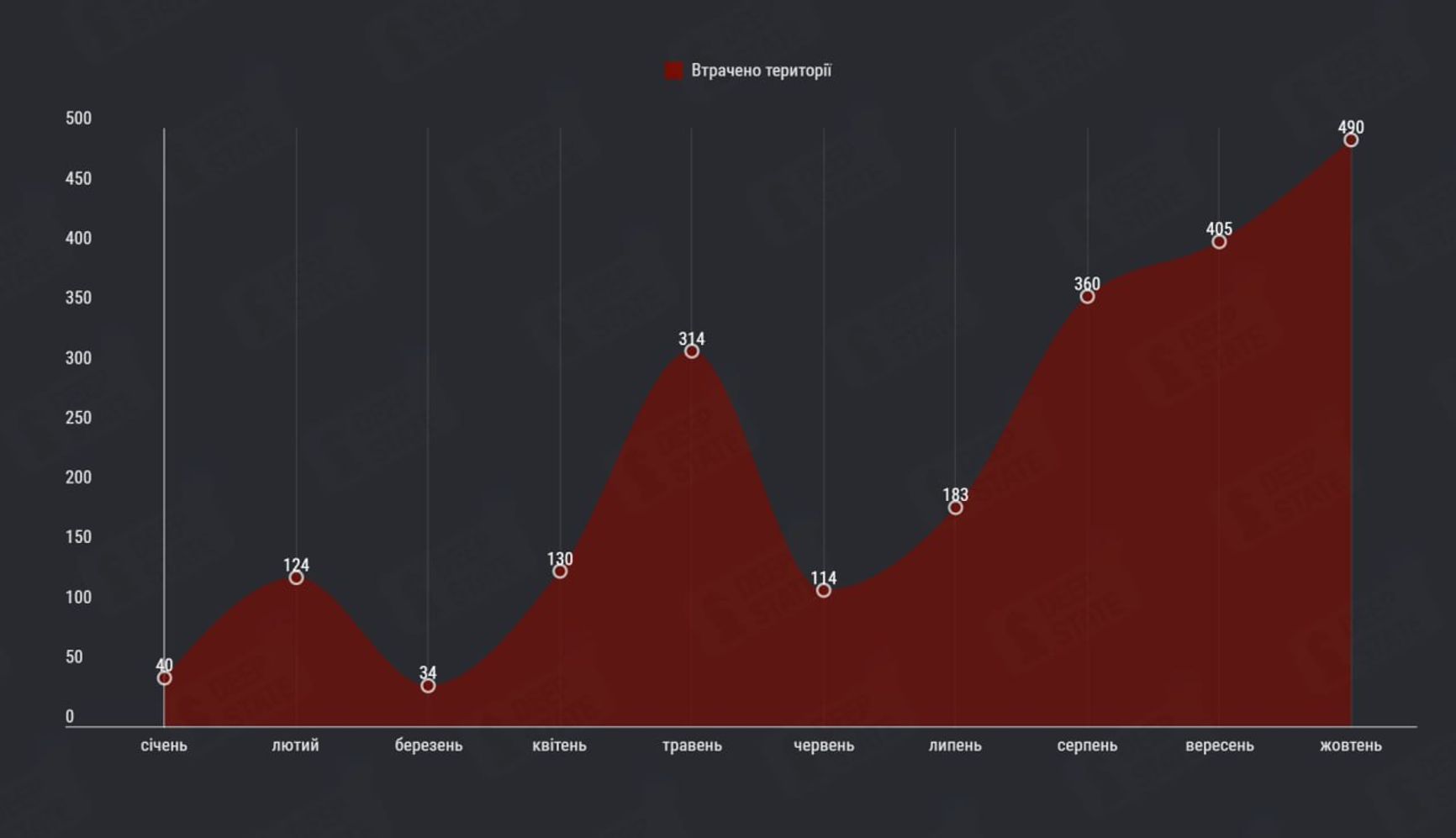 Подсчеты DeepState свидетельствуют, что октябрь стал самым удачным месяцем для ВС РФ с точки зрения территориального продвижения на украинском ТВД. За этот месяц удалось захватить 490 км². Аналитики проекта отмечают, что российское командование реже прибегает к «мясным штурмам», тратит больше времени на обучение личного состава и проводит регулярные ротации.