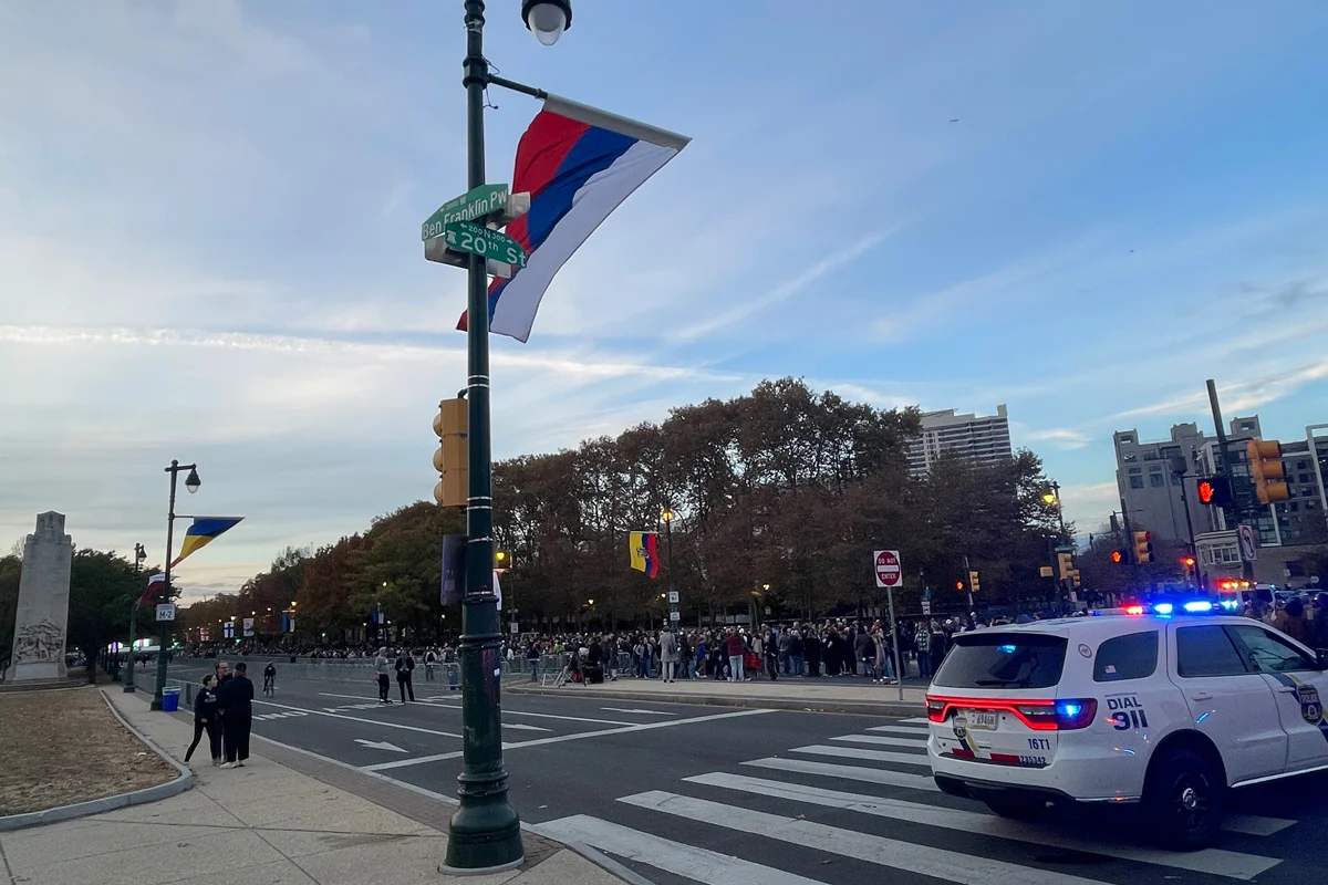 Люди выстроились длинной змейкой в несколько колец вдоль бульвара Бенджамина Франклина, который всегда украшен флагами государств мира. Есть здесь и российский триколор, несмотря на то, что антивоенные активисты не раз пытались его убрать и даже меняли на бело-сине-белый флаг российской оппозиции. Сейчас триколор по-прежнему на месте, потому что мэрия Филадельфии настаивает на том, что на бульваре должны быть именно государственные флаги.