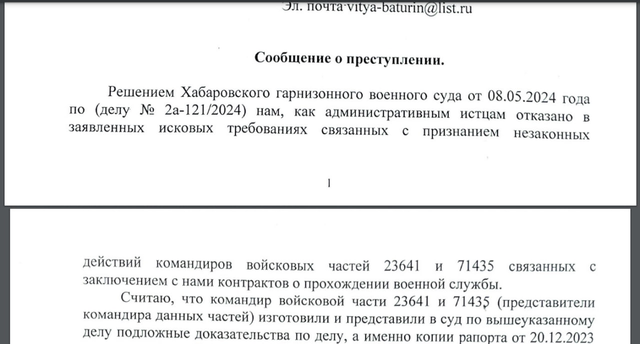 – Сначала в голове не укладывалось, что это специально так его подставили, думали, реально ошибка какая-то – в конце ноября Витя ушел в армию (воинская часть 71435 в сахалинском поселке Лагунное), ему еще 20 лет тогда было. В декабре (месяц прошел – они даже присягу еще не приняли!) случайно узнали про эти контракты, а в январе 2024-го ему перечислили странную сумму – триста тысяч разом, – говорит Евгения. – К тому времени мы уже поняли, что их загоняют в контракты насильно. Представляете, уже не просто угрожают или обманывают – просто подделывают подписи! Мы скооперировались с еще двумя срочниками, "попавшими" с нами на фальшивый контракт, – с парнем из родной Охи Никитой Молочковским и Никитой Борисовым из Сибири – подали в суд на этого командира Нгуена, заявили о преступлении в Следственный комитет лично Бастрыкину (копия документа есть в распоряжении редакции). А судья просто заявила, что это не подделка, что это якобы действительно подписи наших мальчиков! Никакой экспертизы. То есть вообще без вариантов победить в этом суде! Я бы знала – выкрала бы его прямо из части.